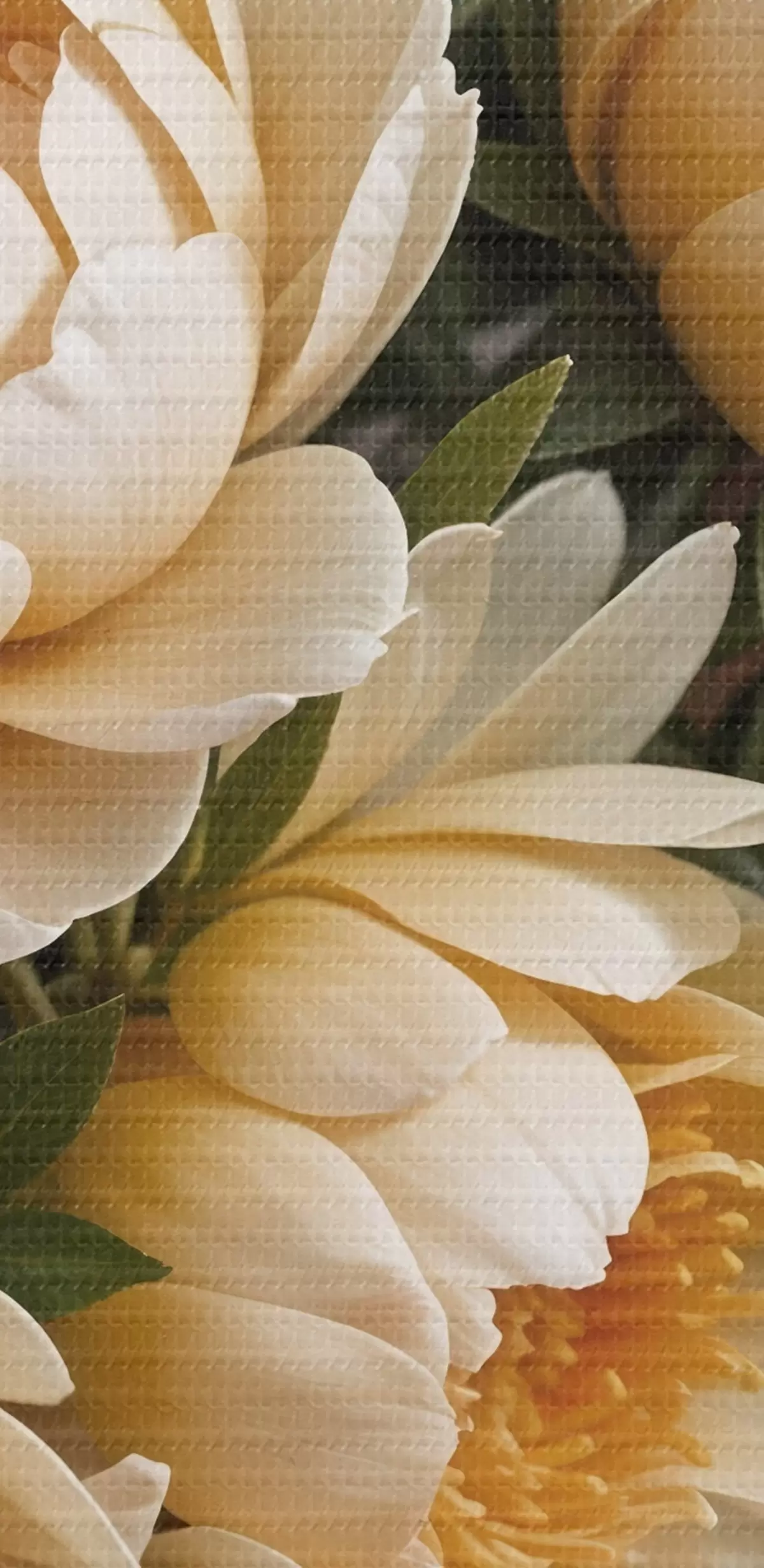Obrázok Krémové detailné kvety pivónie s tmavozelenými listami na sivom pozadí Nr r42215