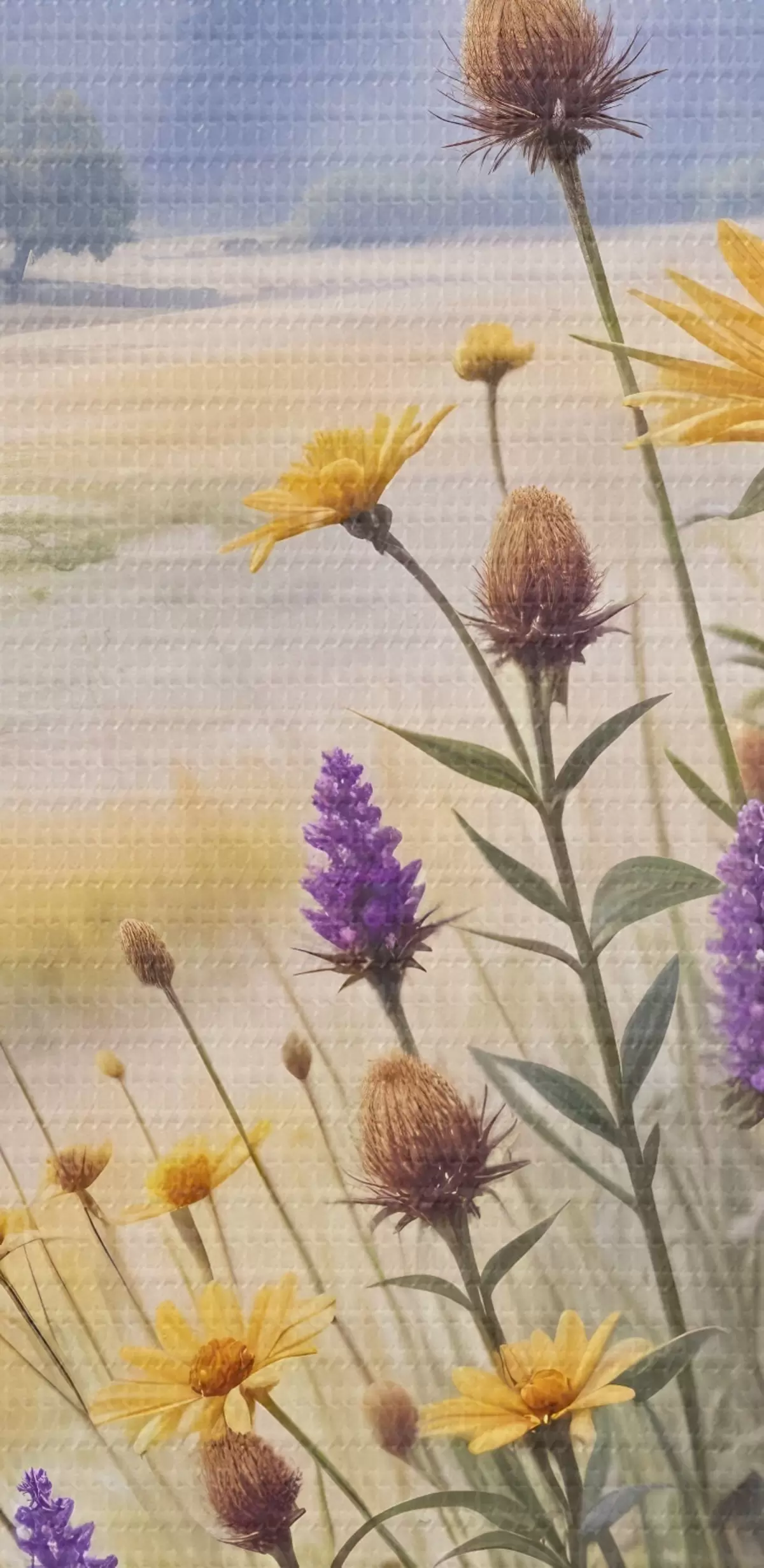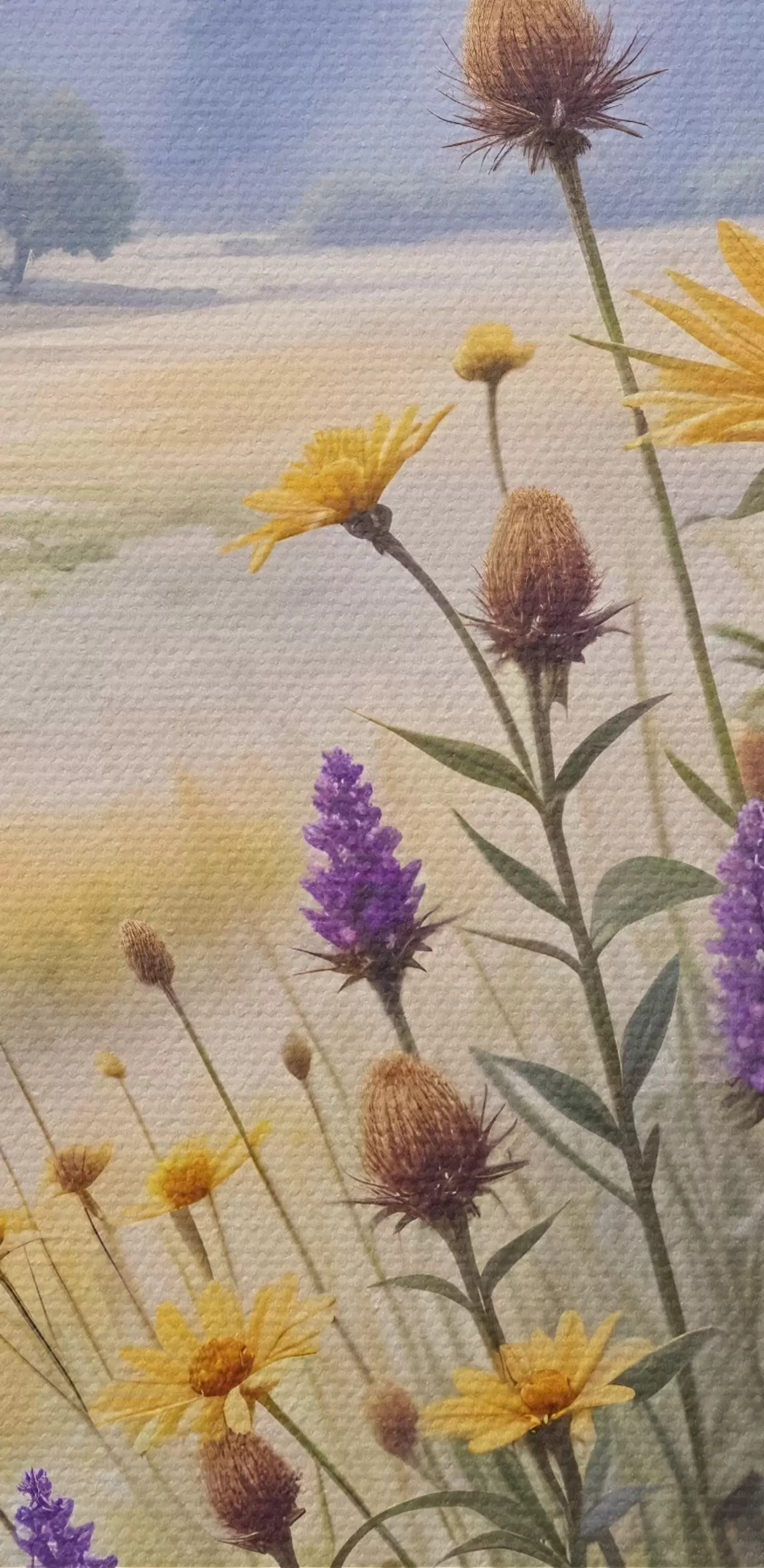Obrázok Pole žltých slnečníc a fialových divokých kvetov v hmlistej lesnej krajine s borovicami v pozadí Nr r42223