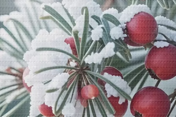 Obrázok Zasnežená vetva borovice s červenými bobuľami , zimná scéna Nr r42238