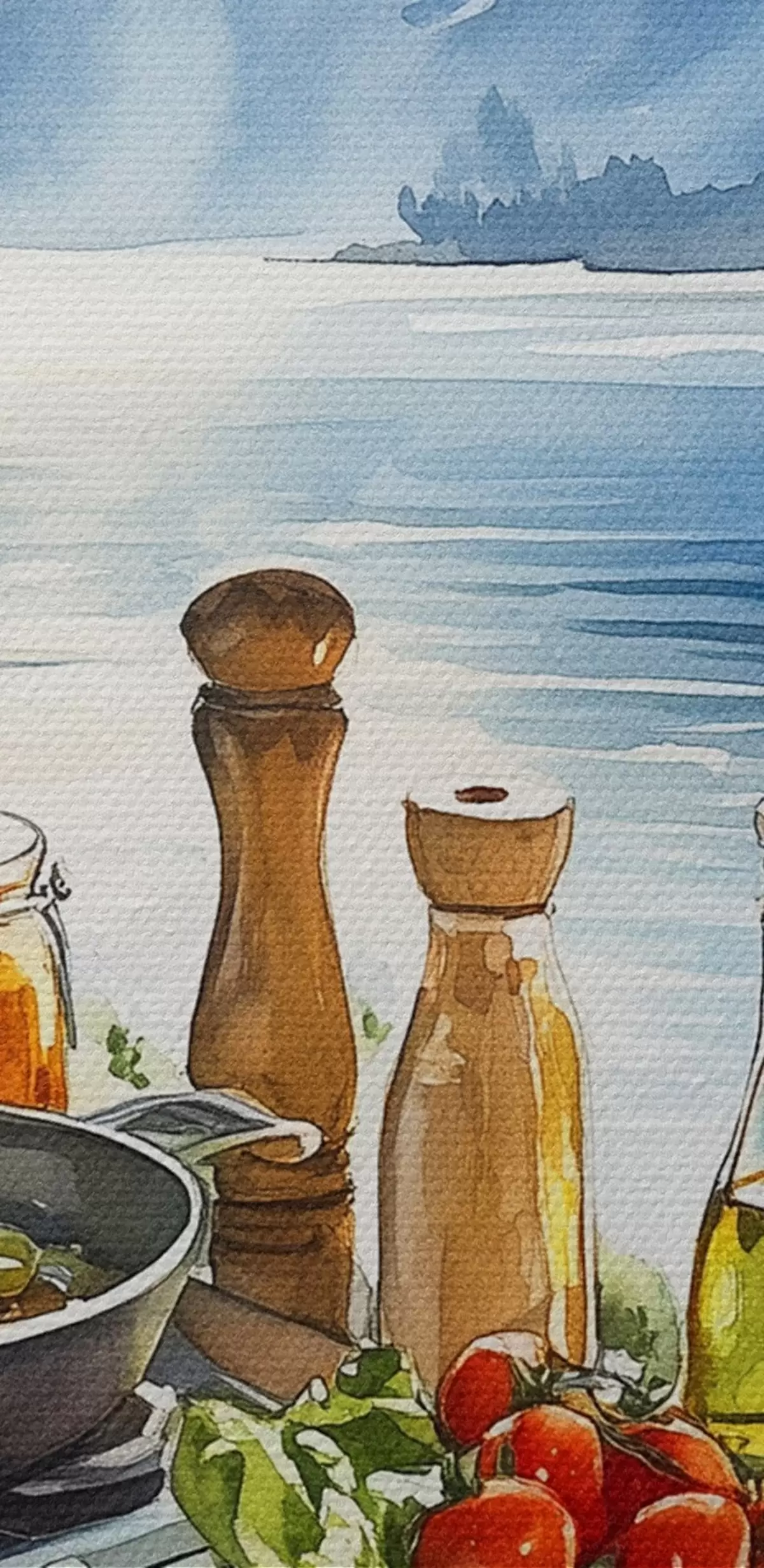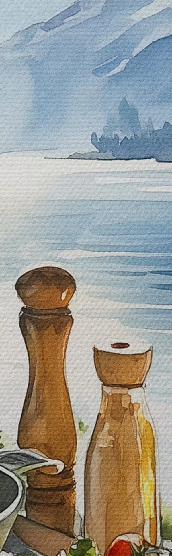 Obrázok Krásne letné ráno, jazero, akvarel, raňajky, cestovanie Nr r42433