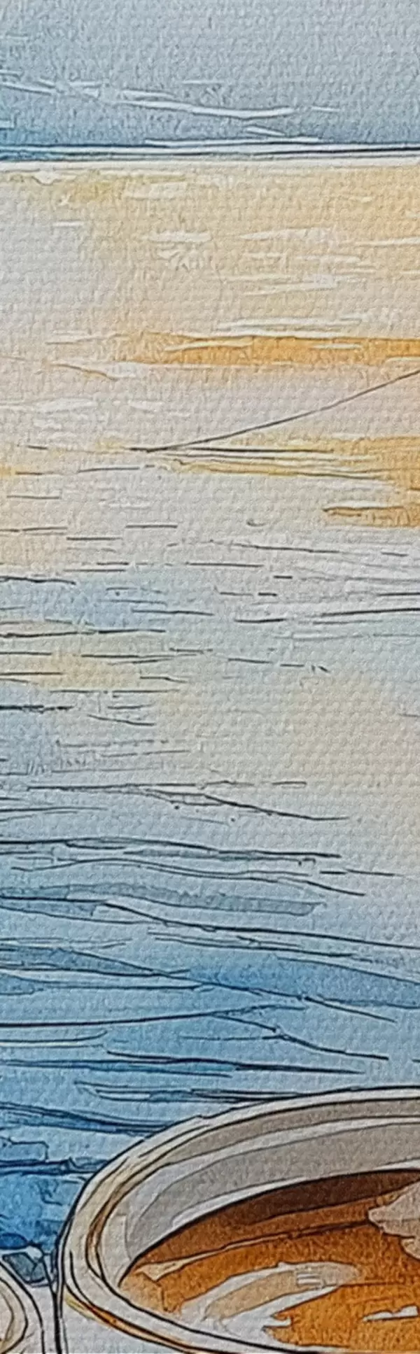Obrázok Západ slnka na jazere, plachetnice, šálky kávy, akvarel Nr r42442