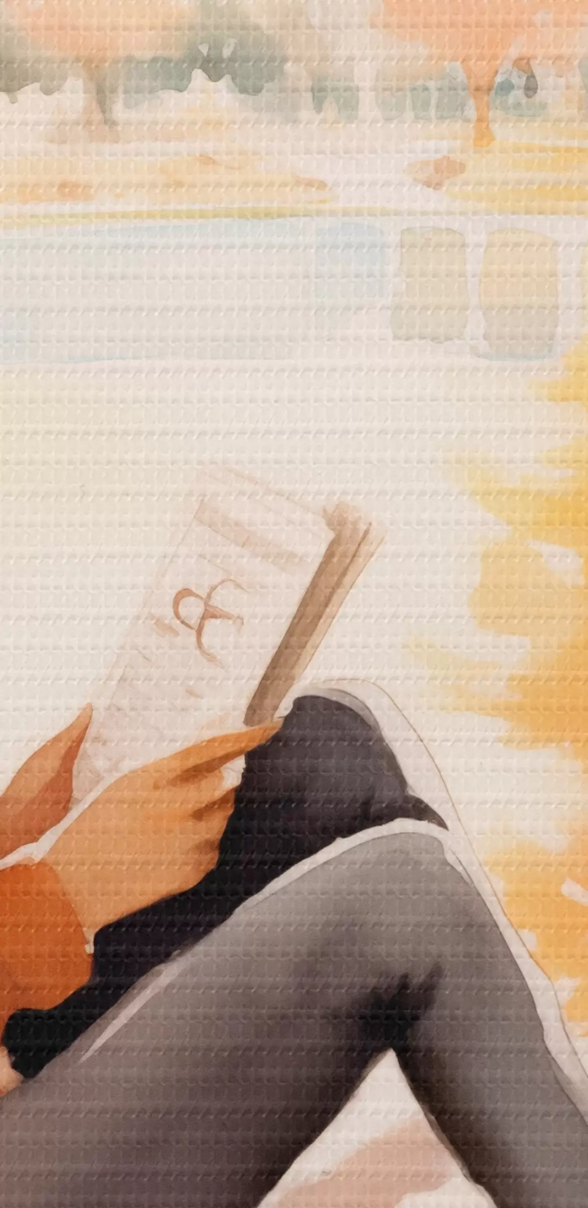 Obrázok Dievča čítajúce knihu pri otvorenom okne v jesennom prostredí, s jasnými stromami v pozadí a šálkou čaju po boku. Nr r42572