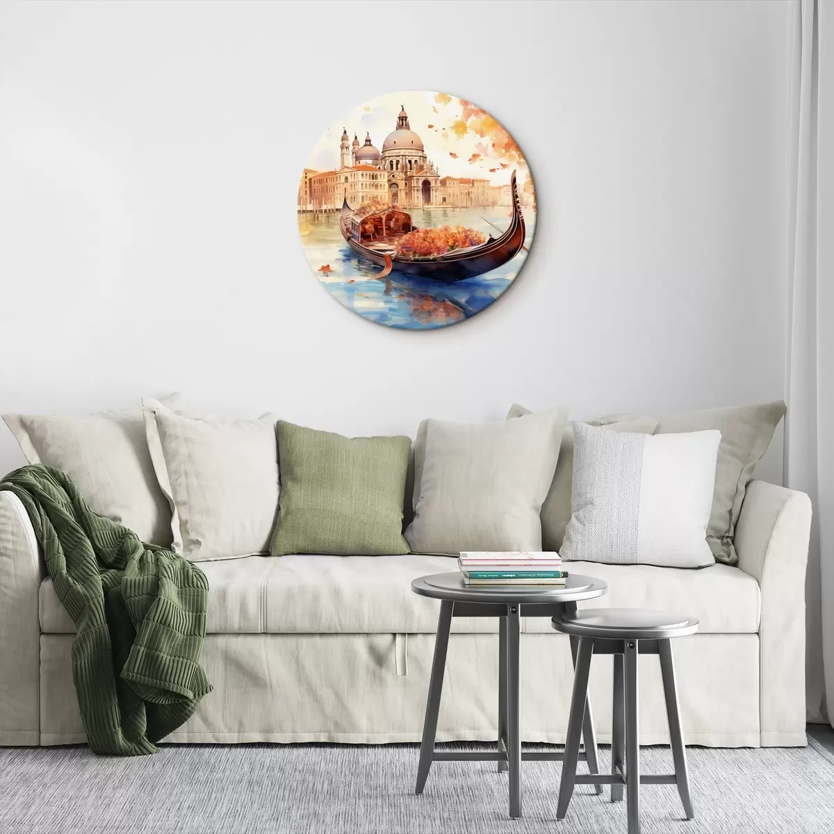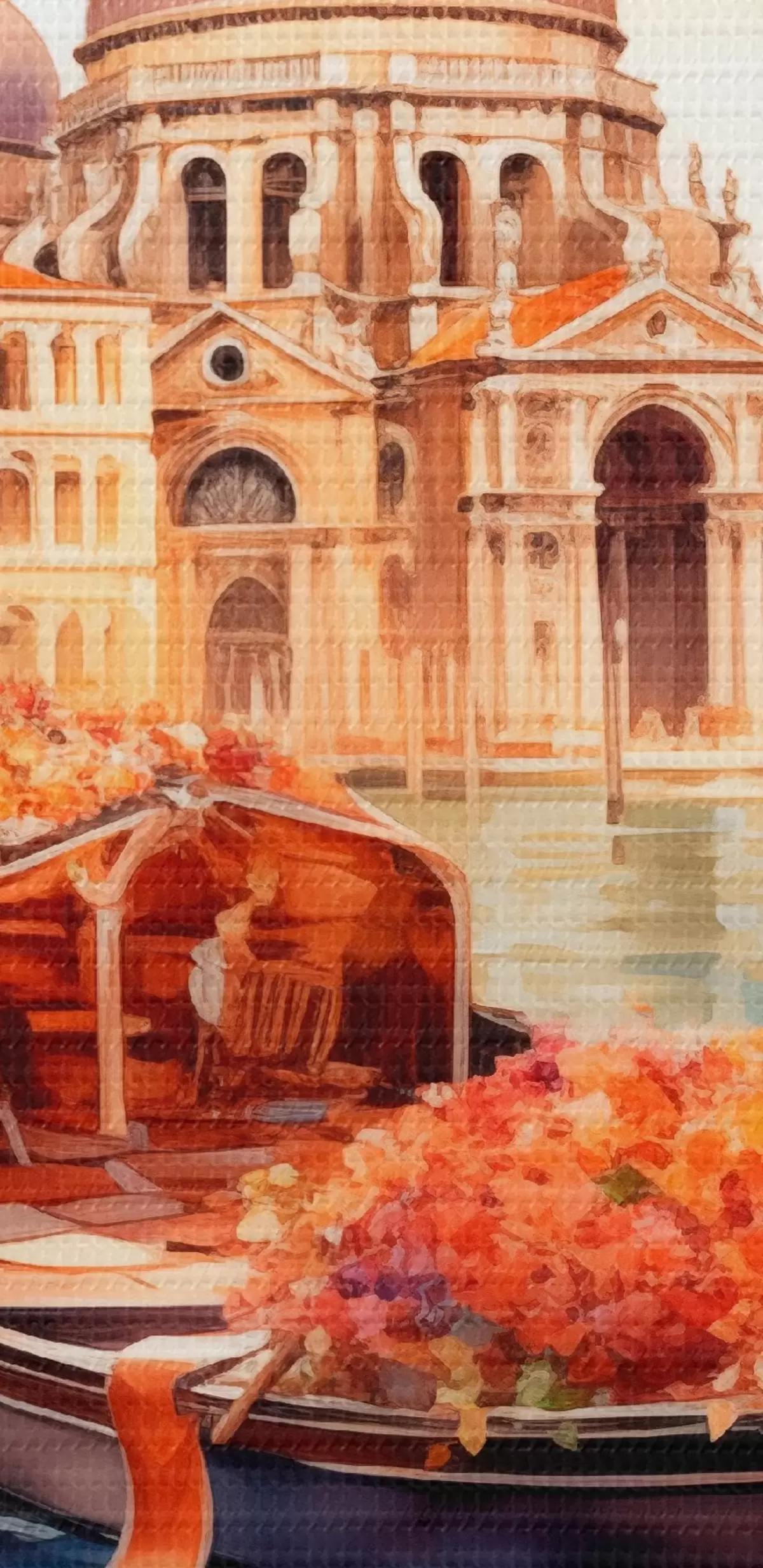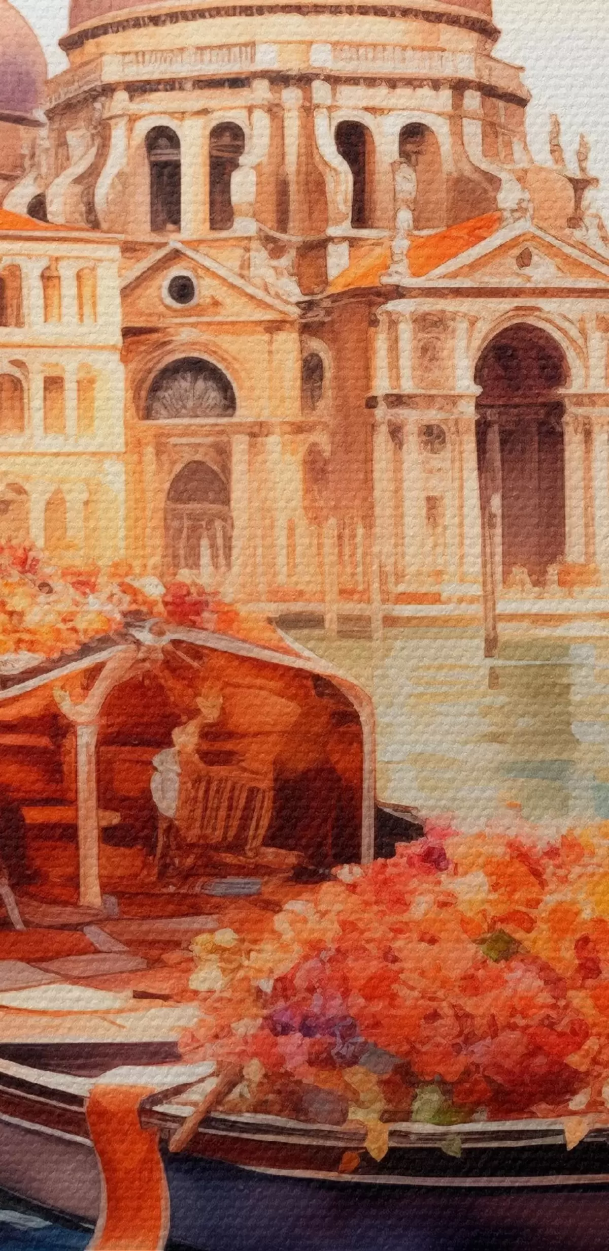 Obrázok Jesenný pohľad na Benátky s gondolou obklopenou žiarivo oranžovým a červeným lístím, s odrazmi budov v pokojnej vode kanála. Nr r42576