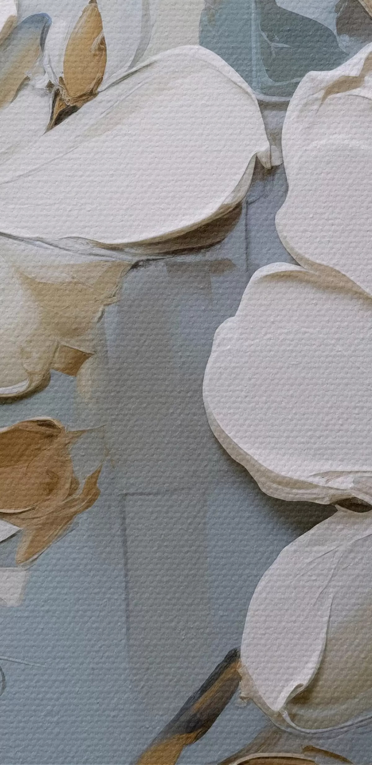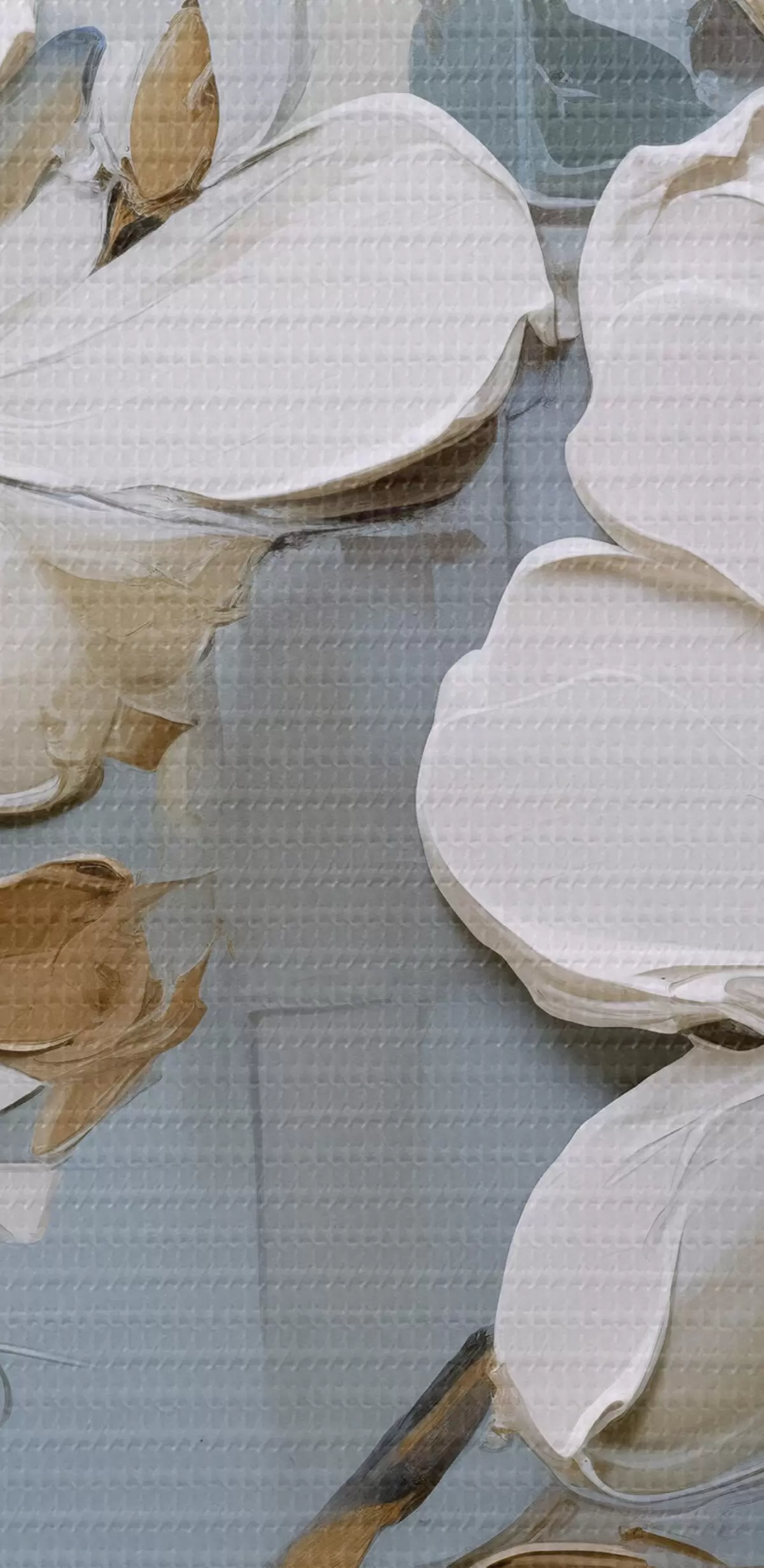 Obrázok Biele kvety magnólie s textúrovanými okvetnými lístkami a hnedými listami na jemnom modrom pozadí imitácia olejomaľby Nr r42711