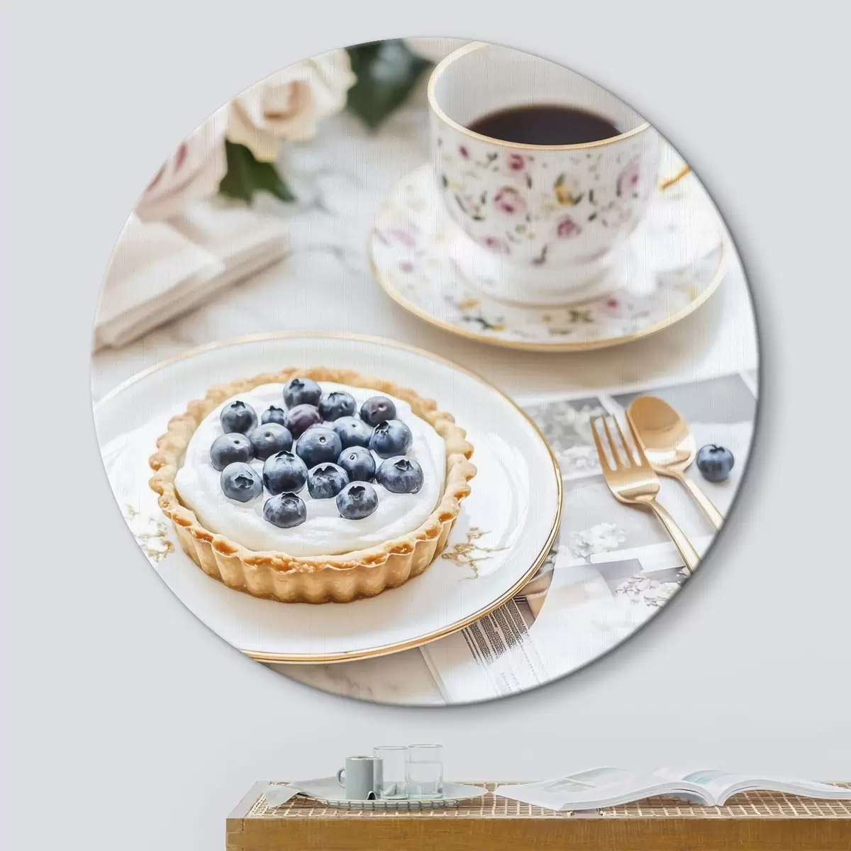 Obrázok Čučoriedkový koláčik so šálkou čaju, boho štýl, ružové ruže Nr r43066