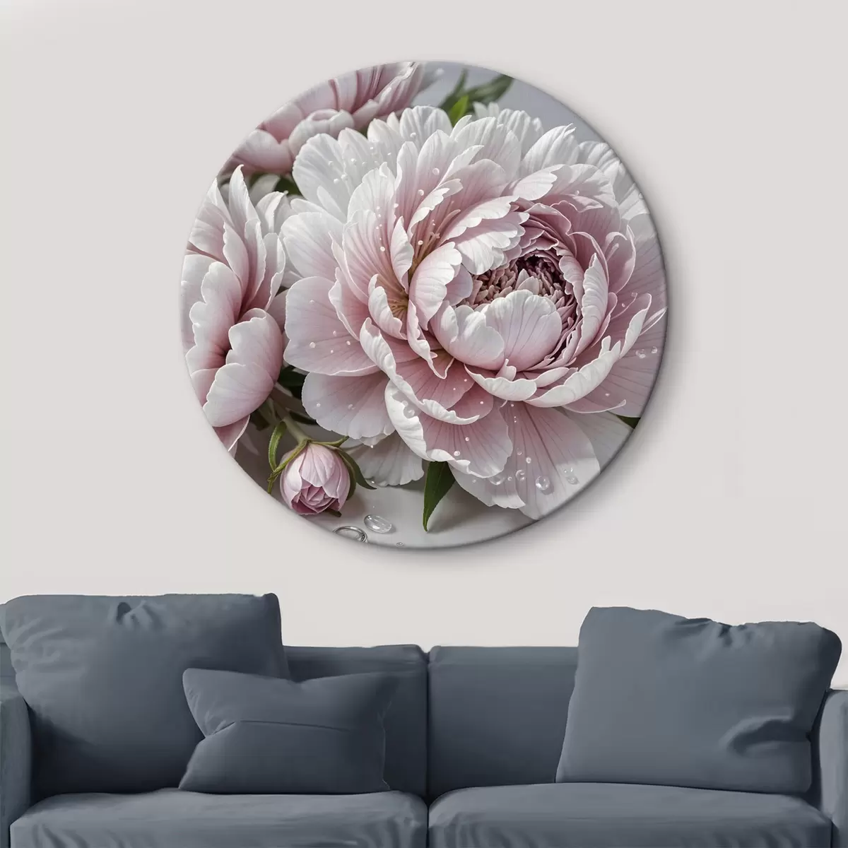 Obrázok Svetloružové a biele pivonky s kvapkami vody na okvetných lístkoch, pozadie je biely povrch Nr r43158