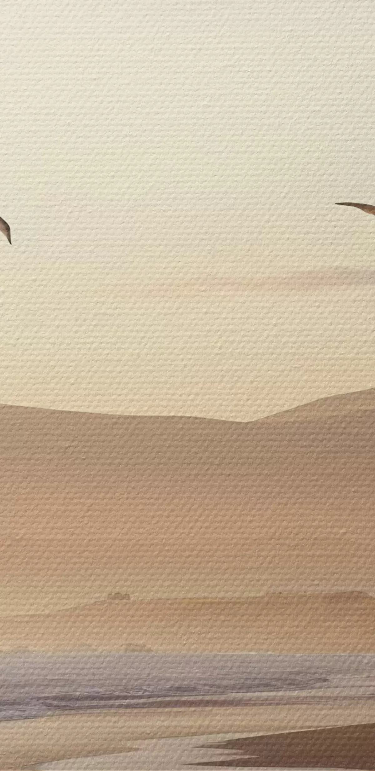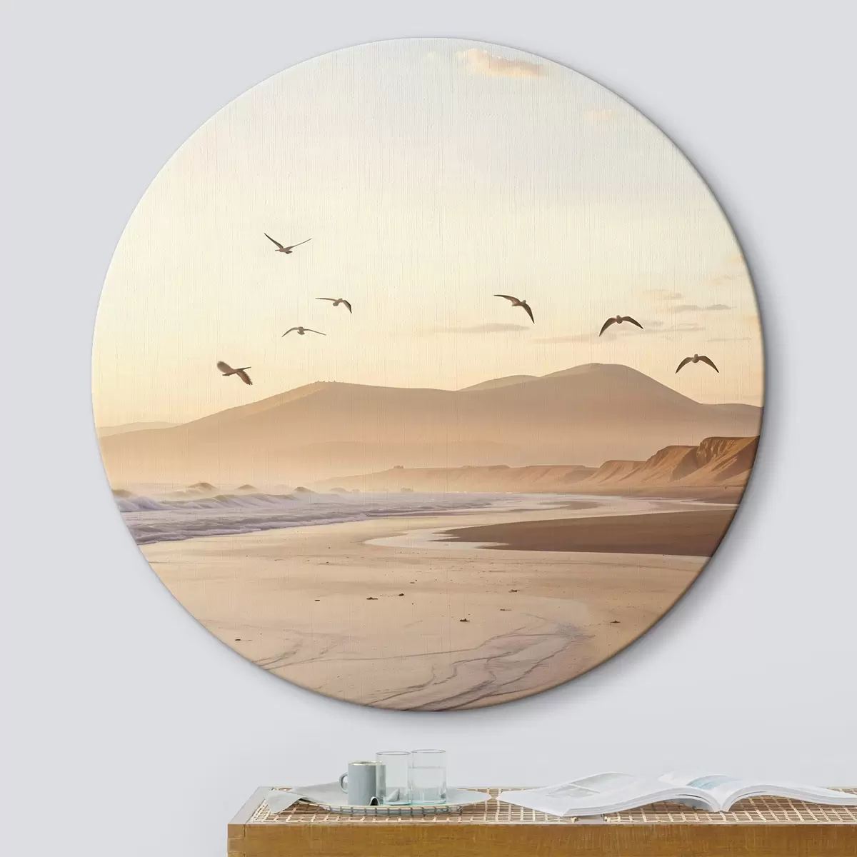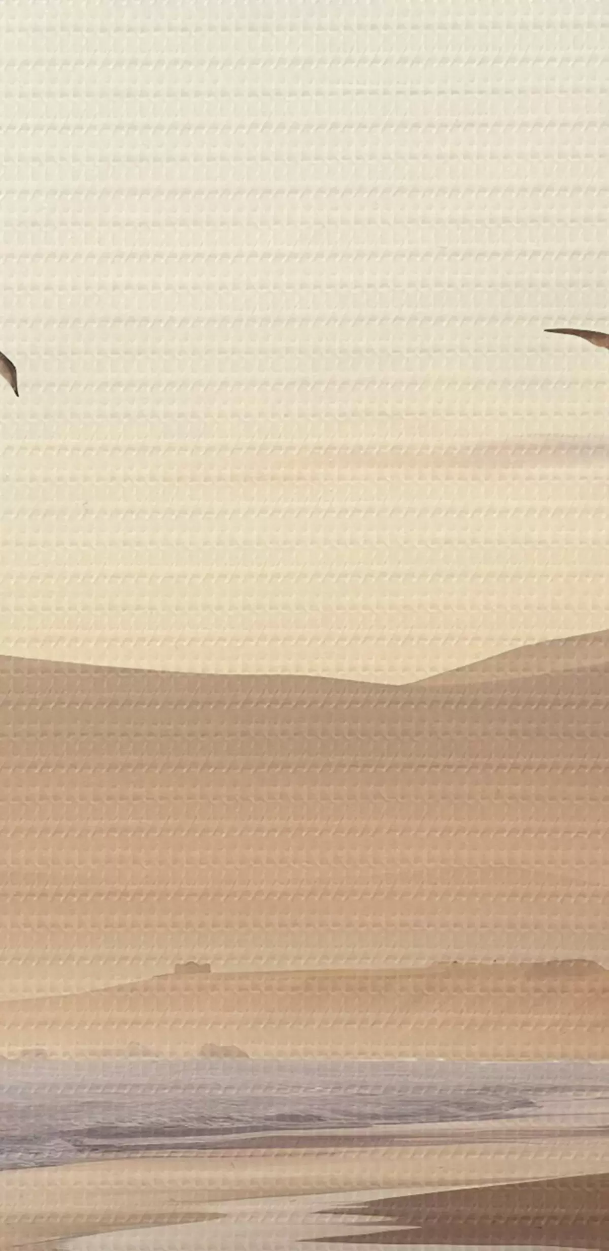 Obrázok Vtáky lietajúce nad plážou s oceánom, hory v pozadí, teplé farby, jemná pastelová paleta Nr r43162