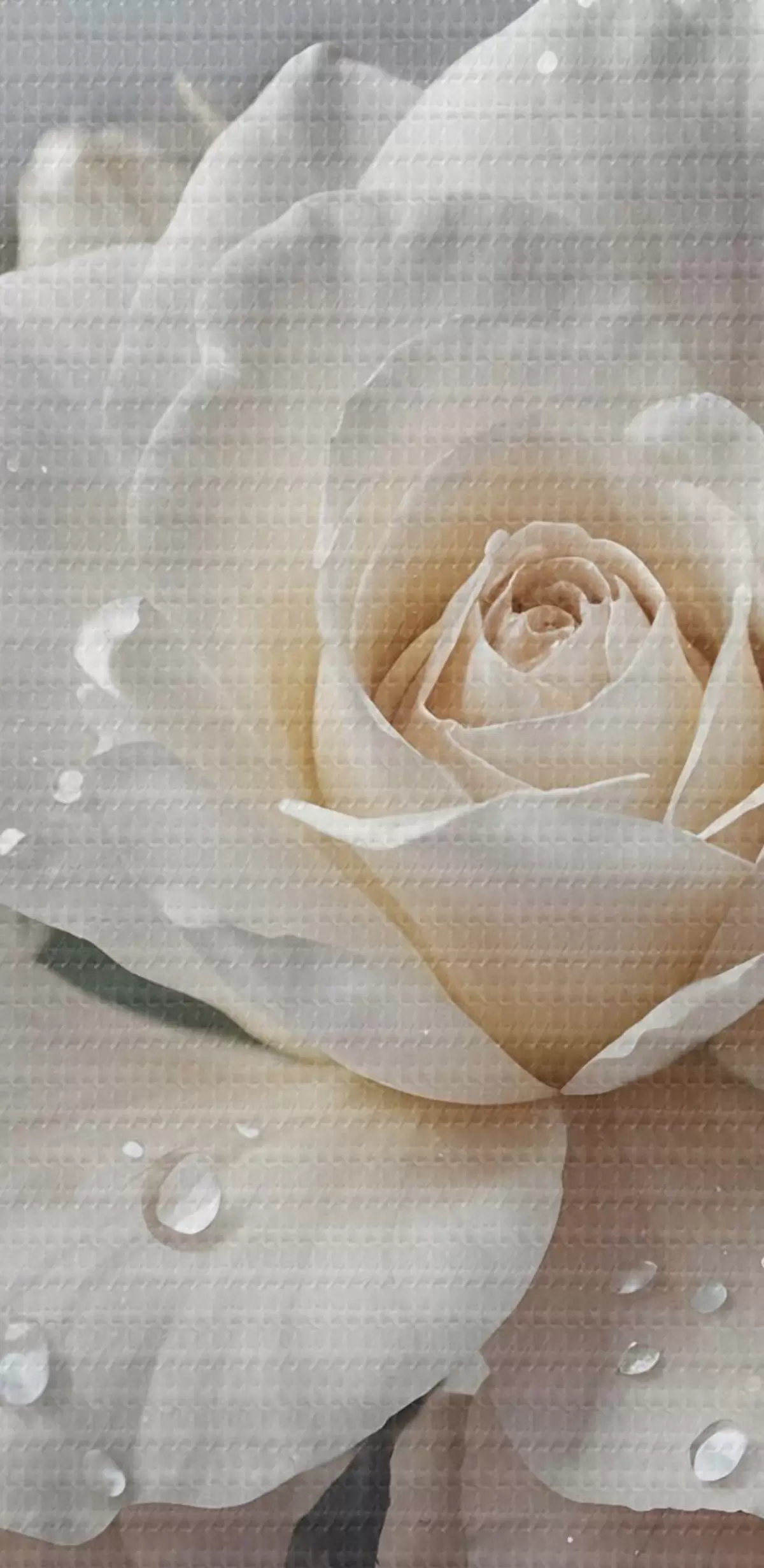 Obrázok Skupina bielych ruží s kvapkami vody na okvetných lístkoch, zelené listy, tlmené pozadie, mäkké svetlo Nr r43163