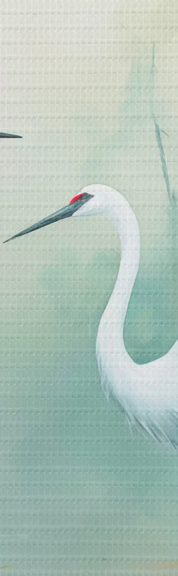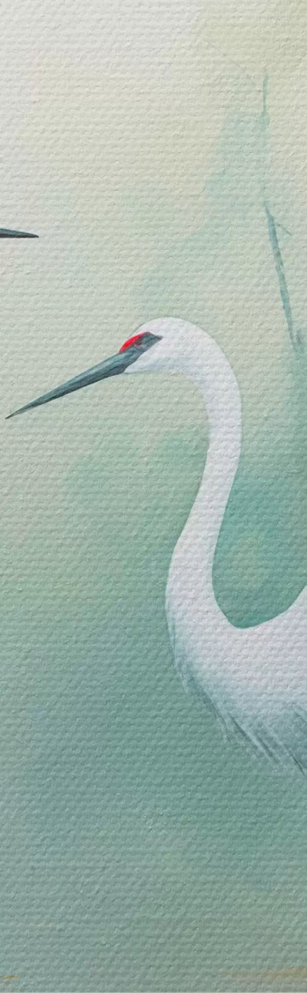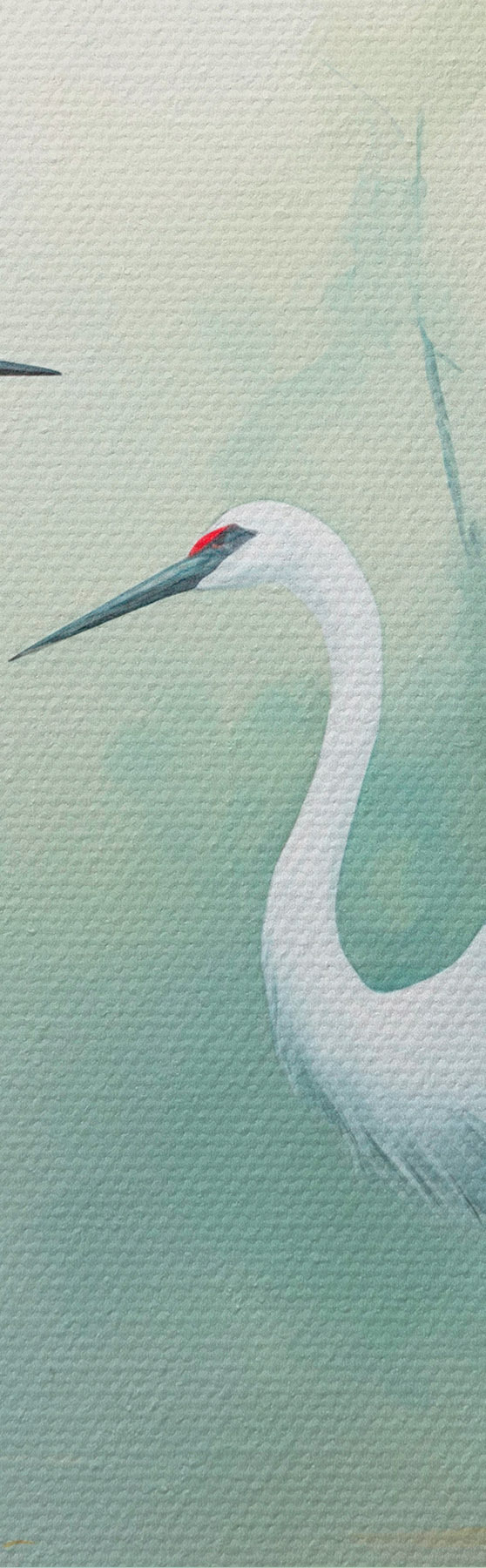 Obrázok Dva biele žeriavy stojace v rybníku , obklopené sviežim zeleným lesom s mäkkým, rozptýleným osvetlením Nr r43166