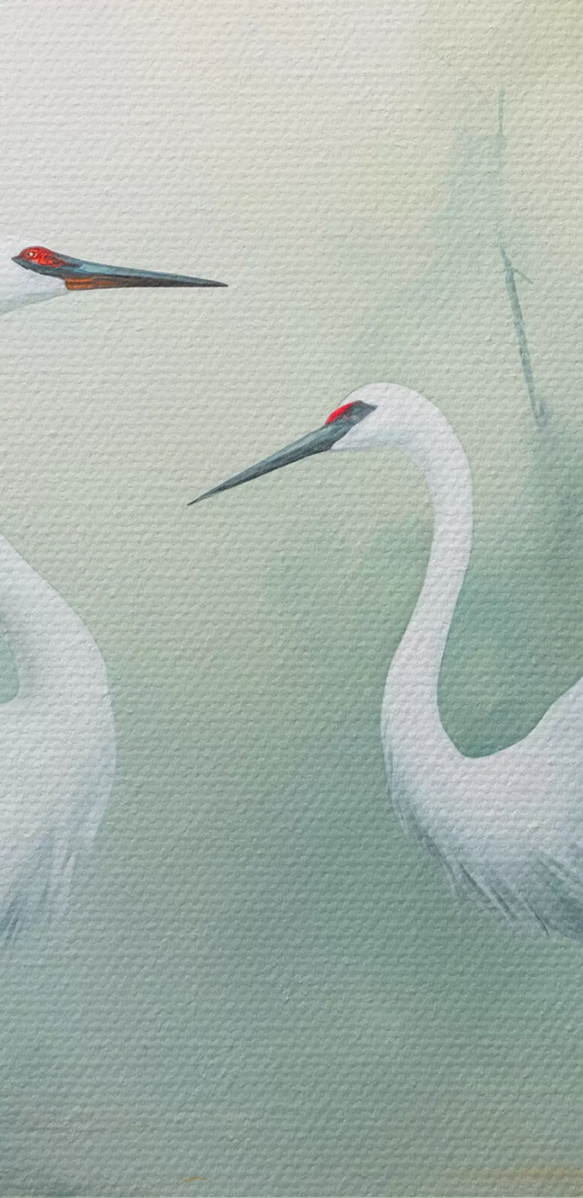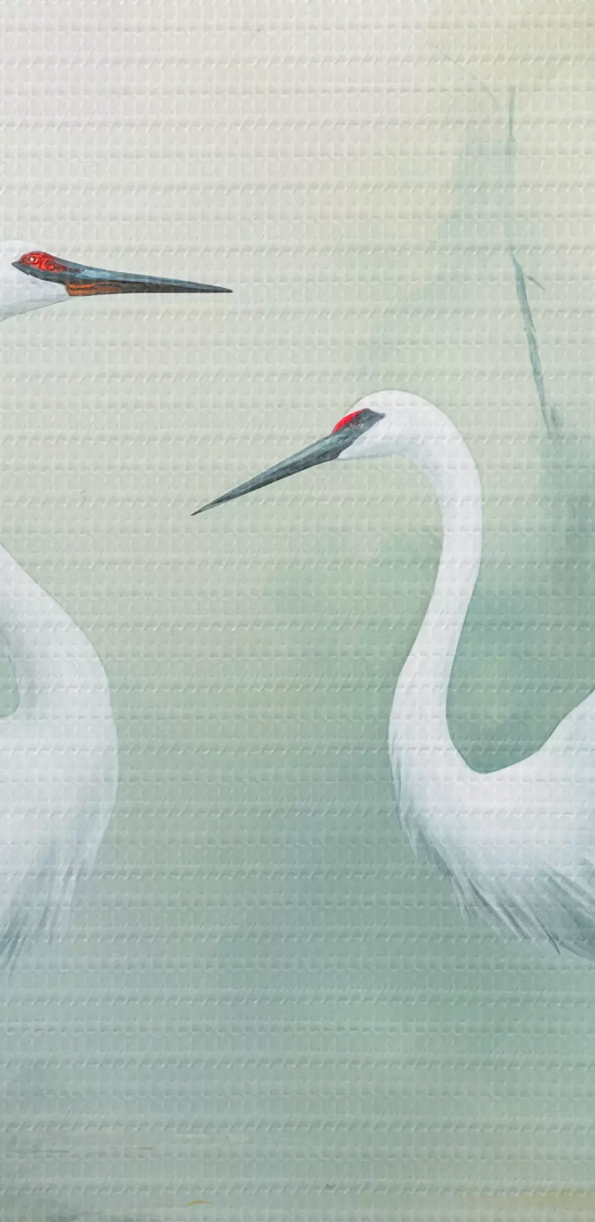 Obrázok Dva biele žeriavy stojace v rybníku , obklopené sviežim zeleným lesom s mäkkým, rozptýleným osvetlením Nr r43166