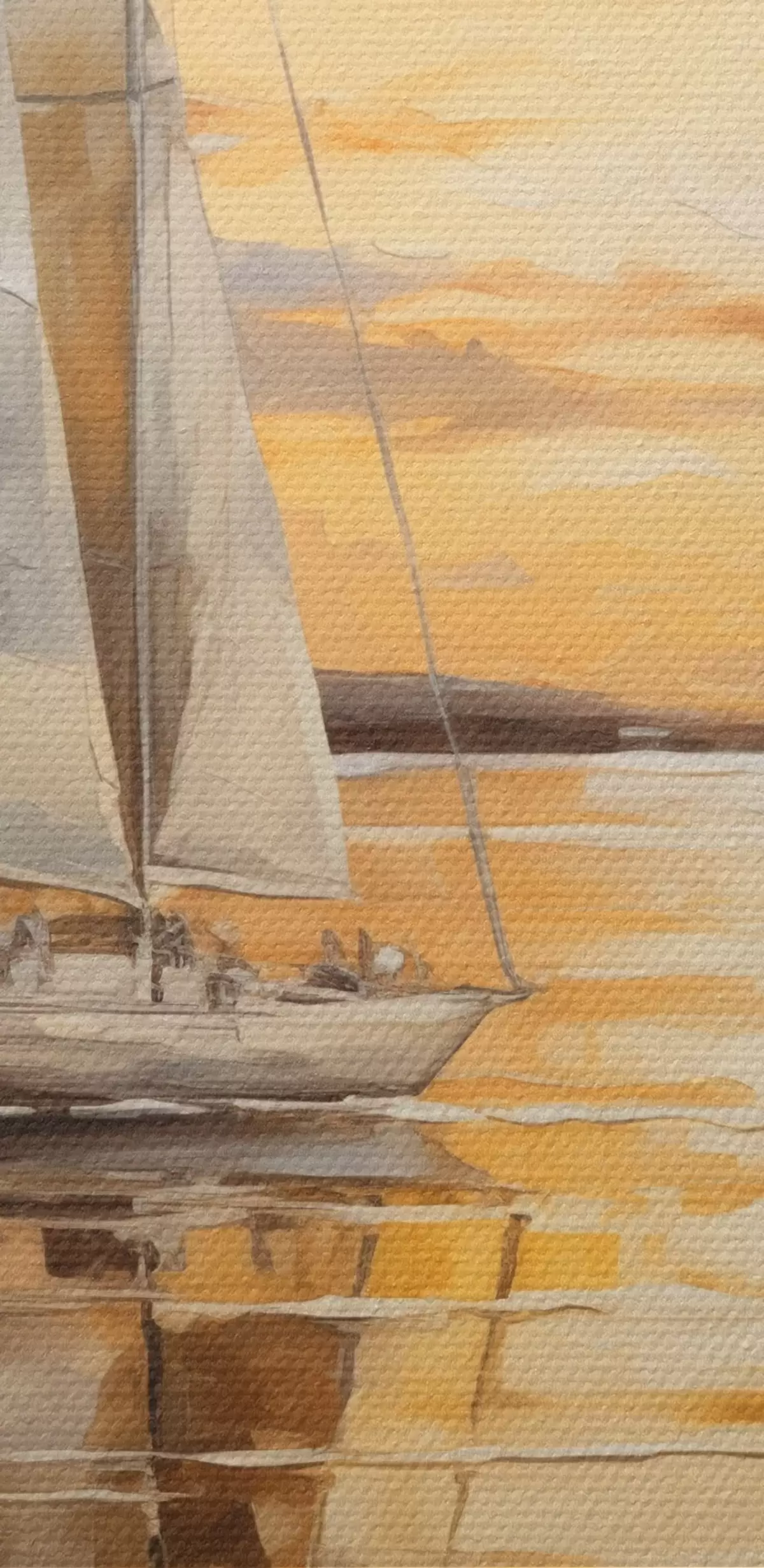 Obrázok Krajinomaľba s plachetnicou na pokojnom mori, oranžová a žltá obloha, vzdialené hory Nr r43169