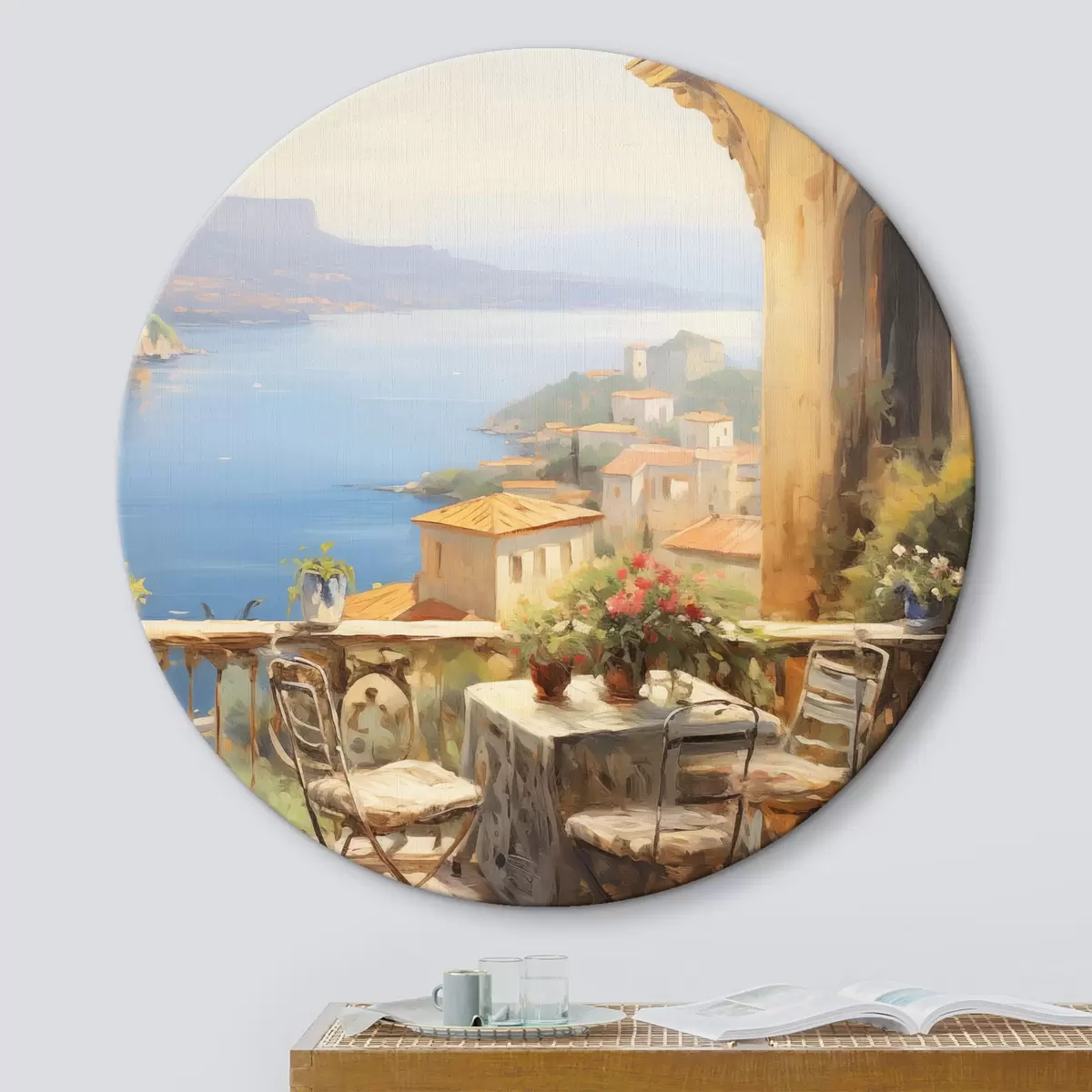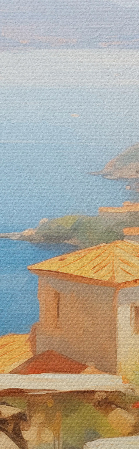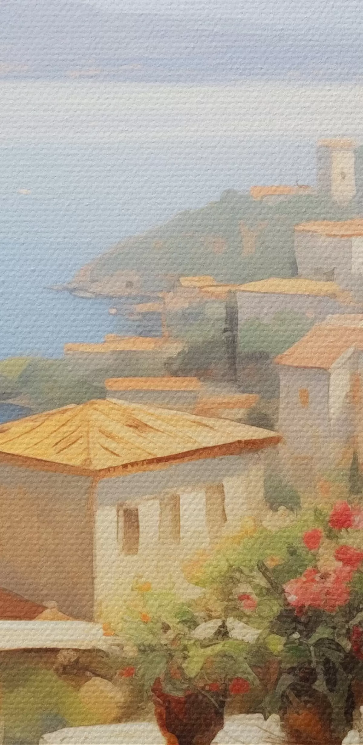 Obrázok Olejomaľba imitácia balkóna s kvetmi, s výhľadom na more, domy na pobreží, slnečný deň, modrá obloha Nr r43173