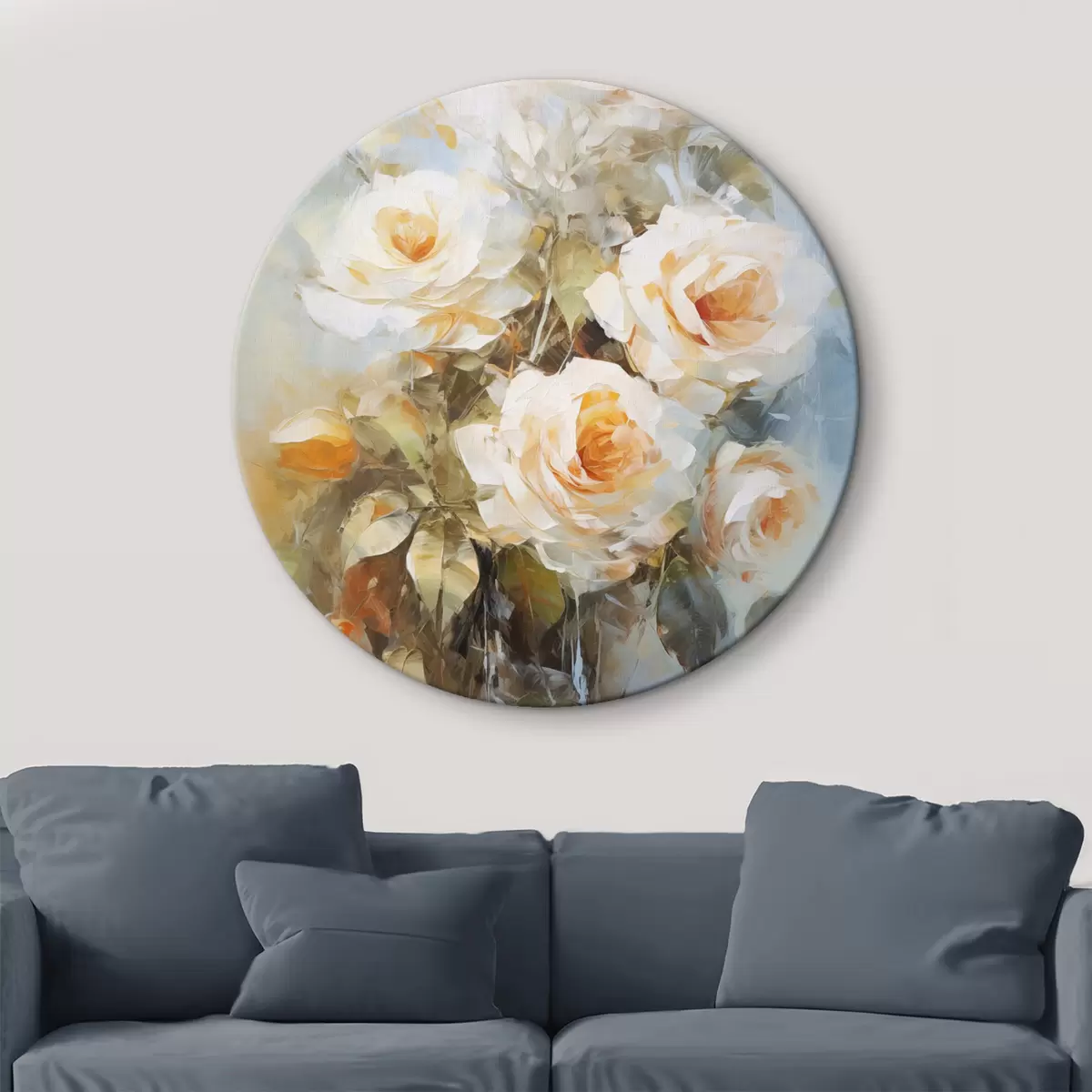 Obrázok Biele ruže s oranžovou farbou na jemnom, svetlomodrom pozadí, s viditeľnými ťahmi štetca a maliarskym štýlom Nr r43175