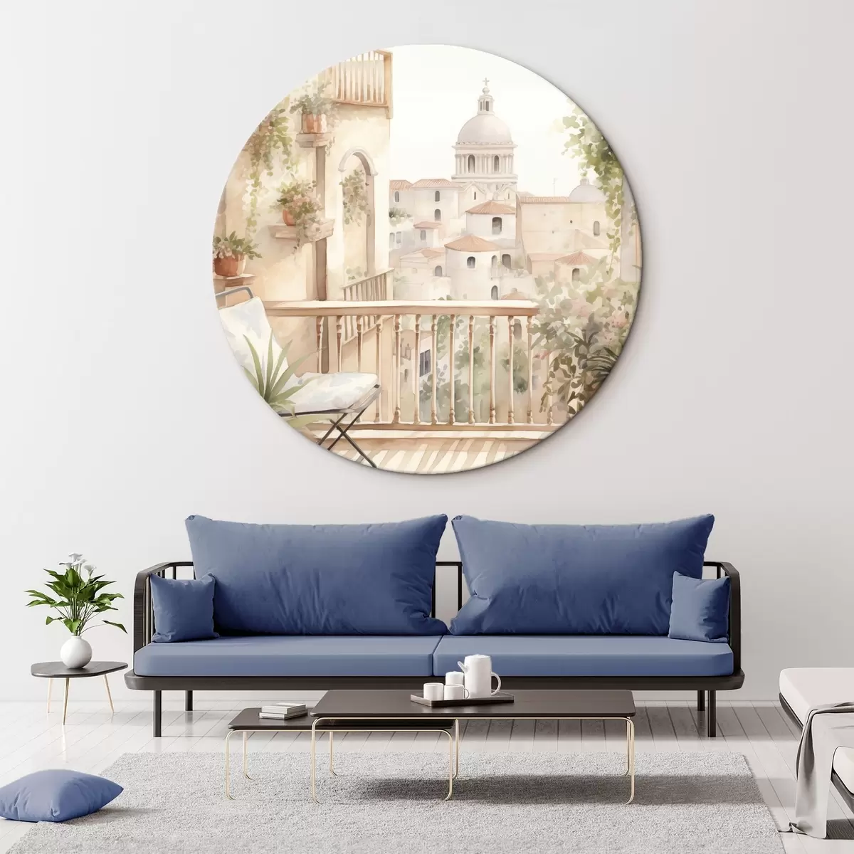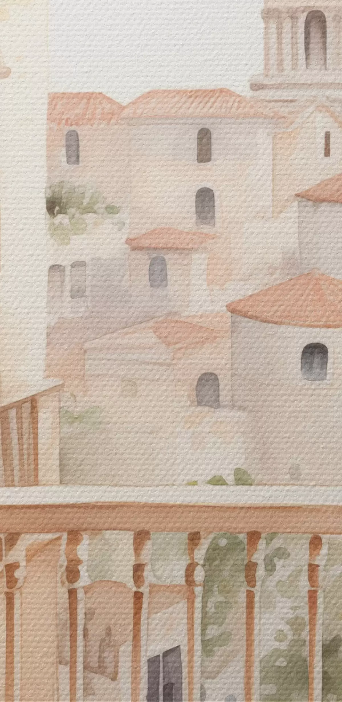 Obrázok Estetický letný balkón, Španielsko, stará architektúra, blomming, akvarel Nr r43180