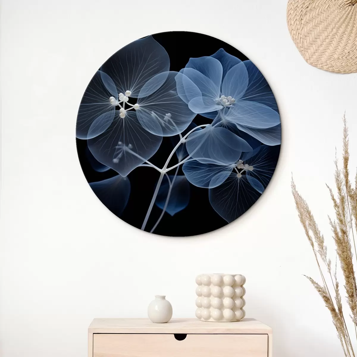 Obrázok Priesvitný modrý kvet hortenzie s modrými tyčinkami a jemnou stonkou na čiernom pozadí Nr r43395