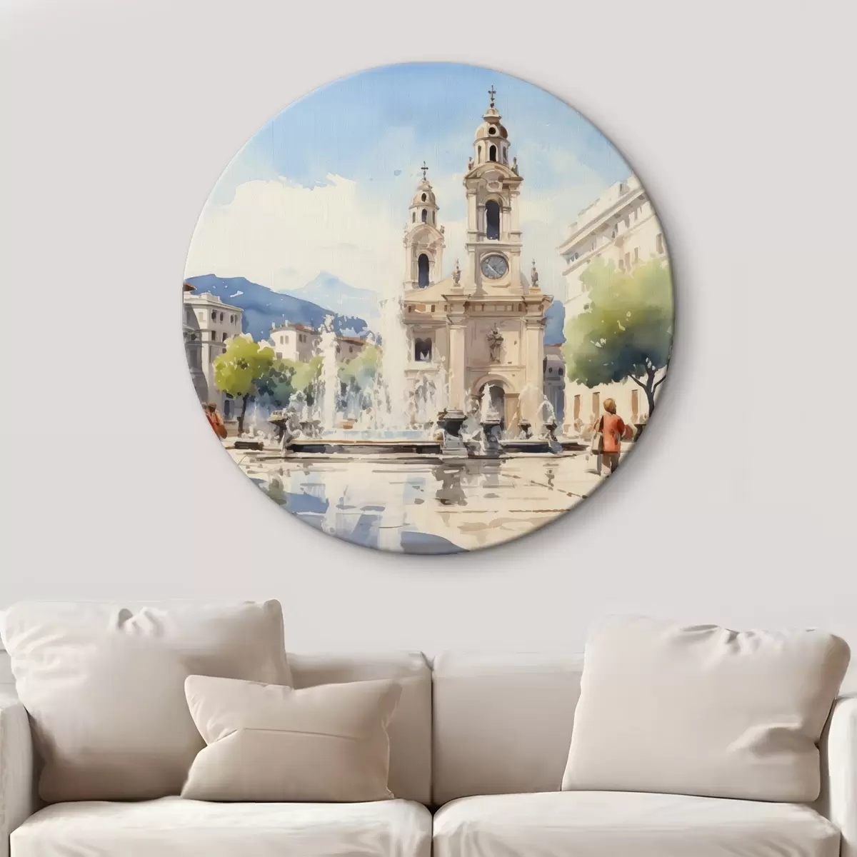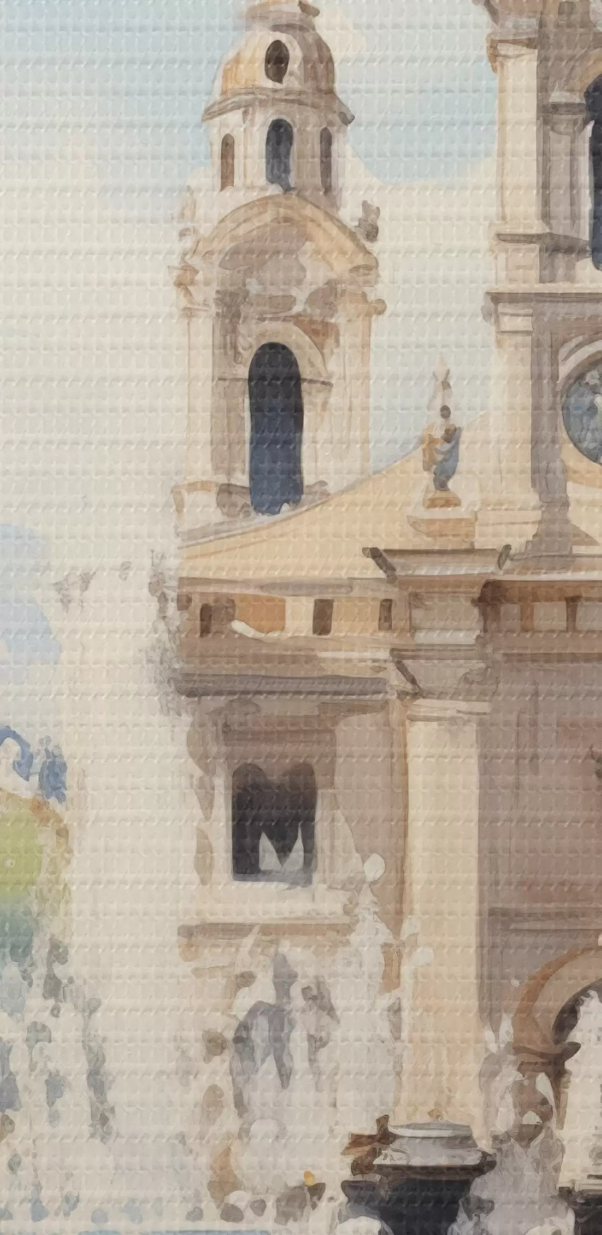 Obrázok Abstraktná mestská krajina s vežou a fontánou na námestí, hory v diaľke, akvarel Nr r43397