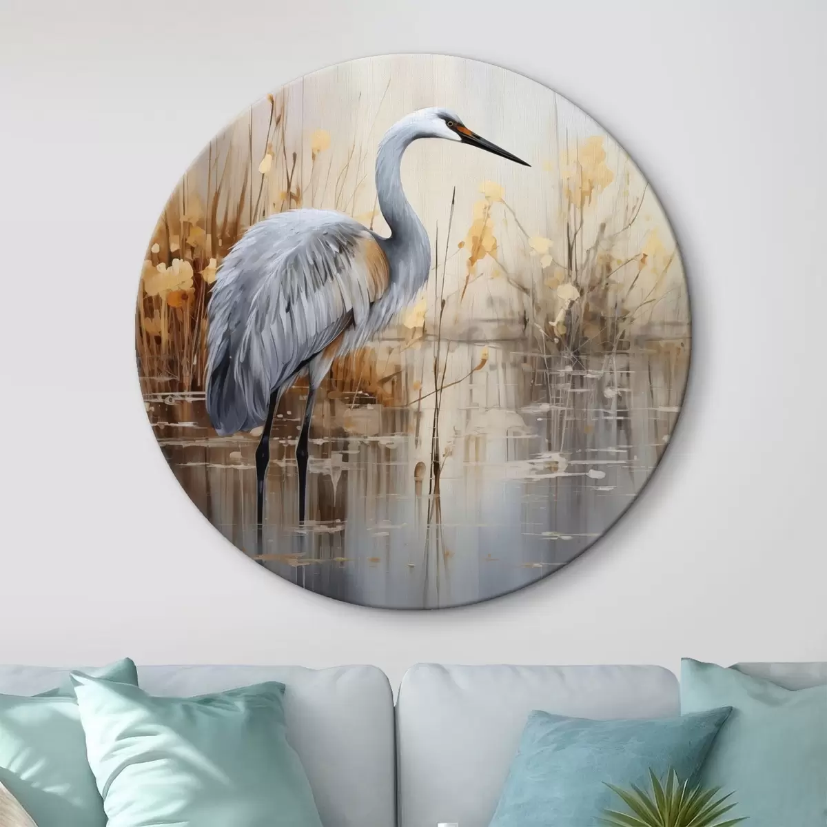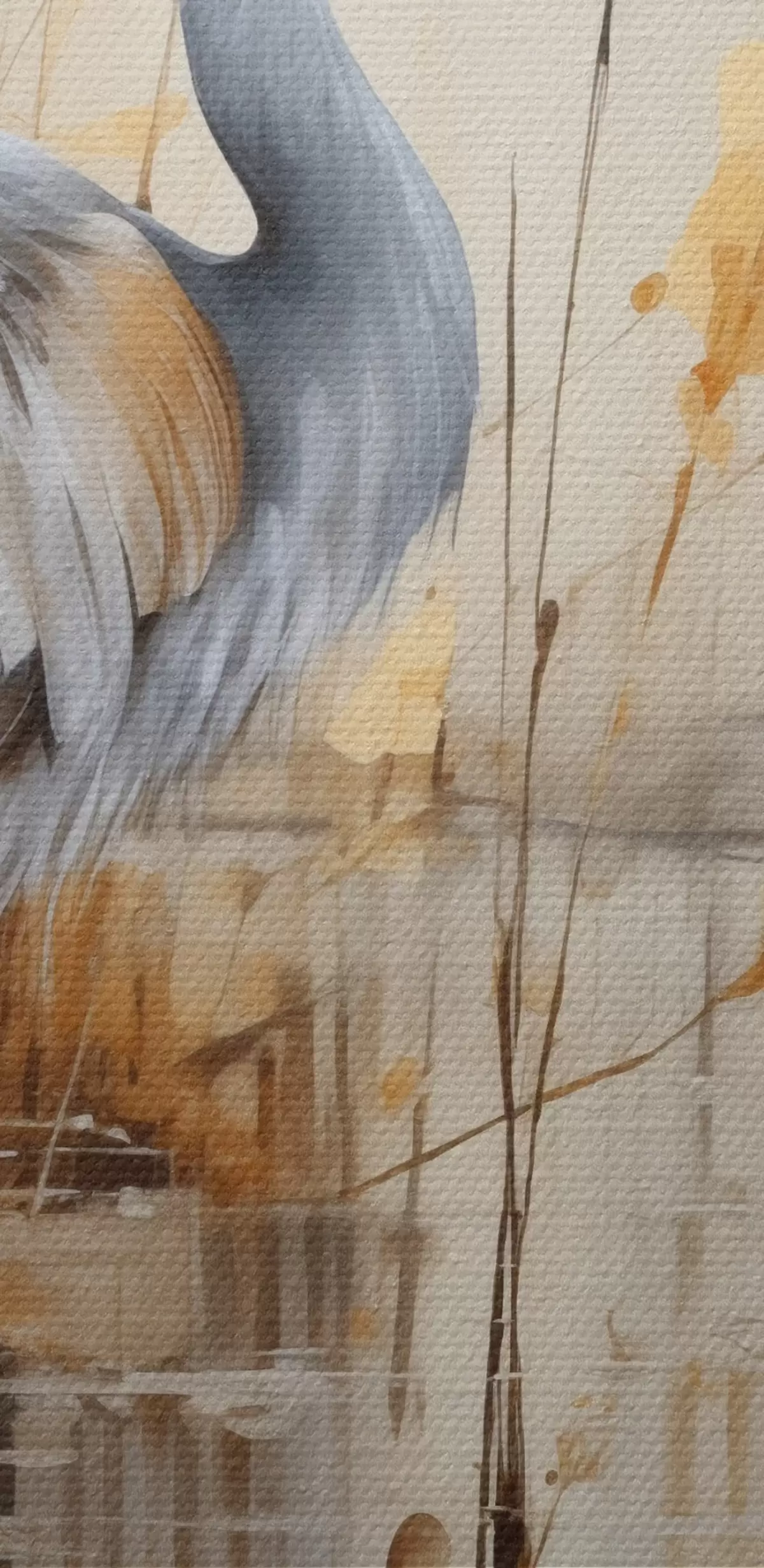 Obrázok Sivá volavka stojaca v rybníku , obklopená vysokými, tenkými rastlinami, pozadie je jemná zmes béžovej a bielej farby Nr r43398