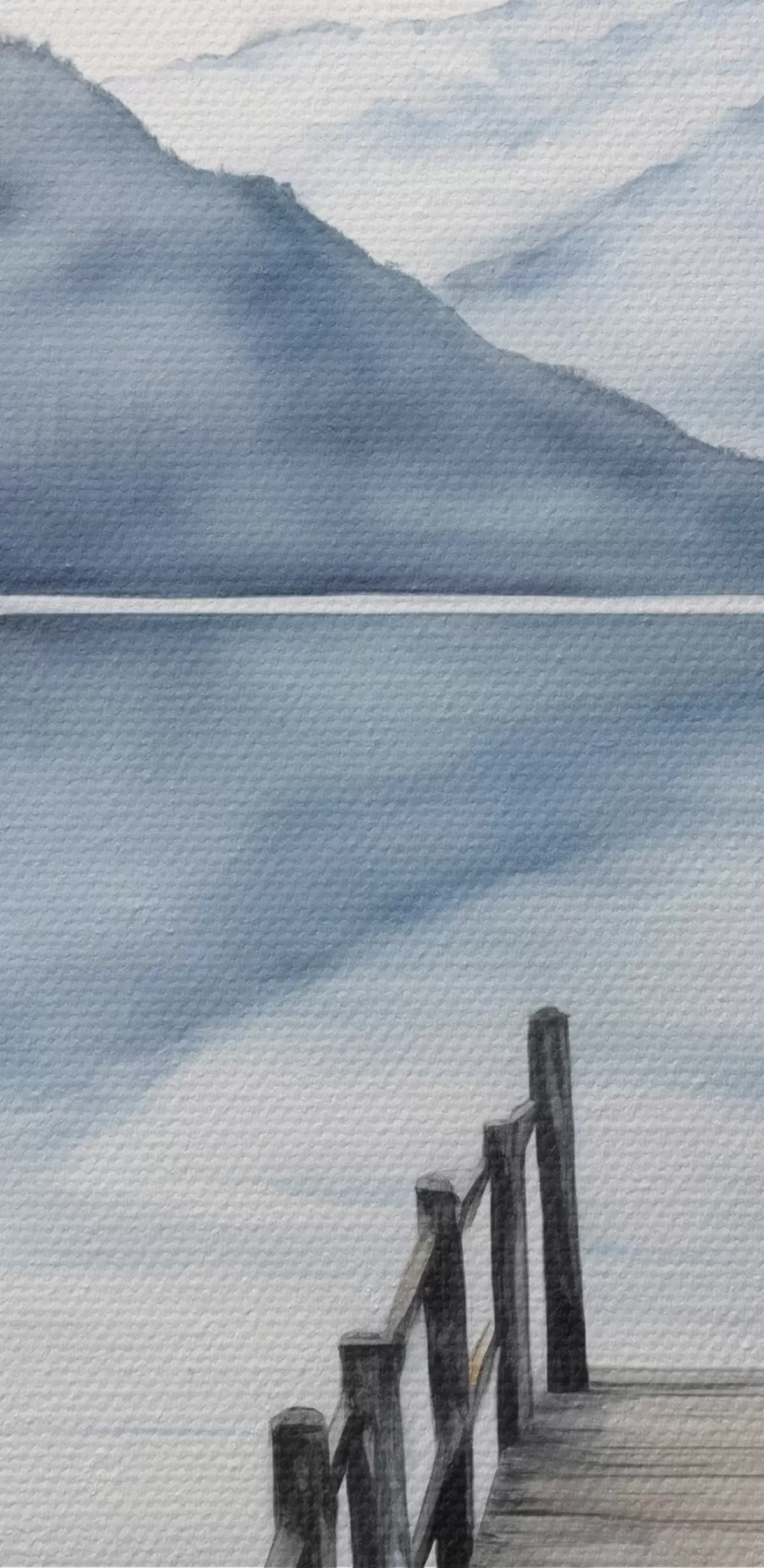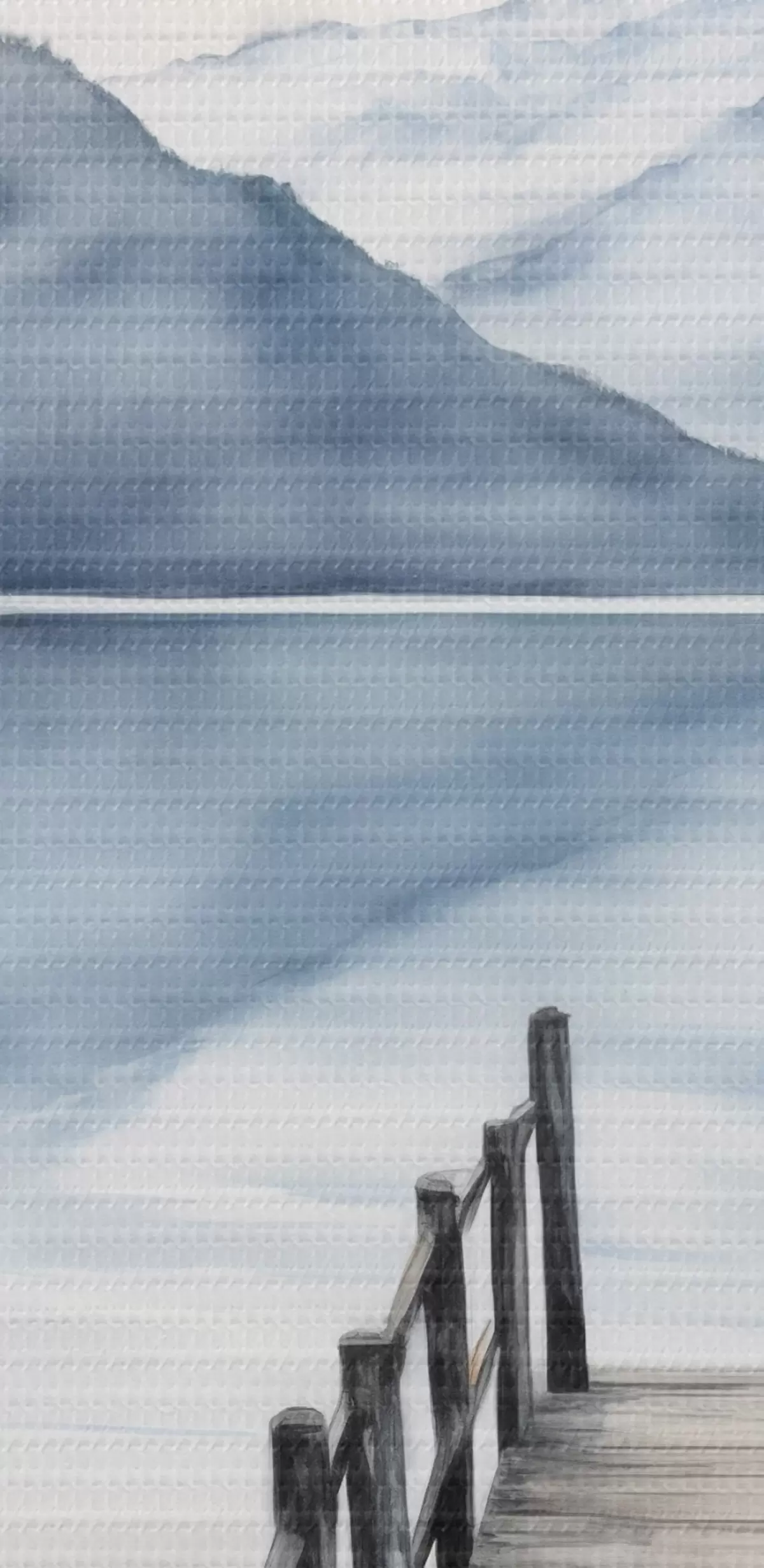 Obrázok Drevené mólo sa rozprestiera na pokojnom jazere, obklopené horami a vždyzelenými stromami, akvarel Nr r43405