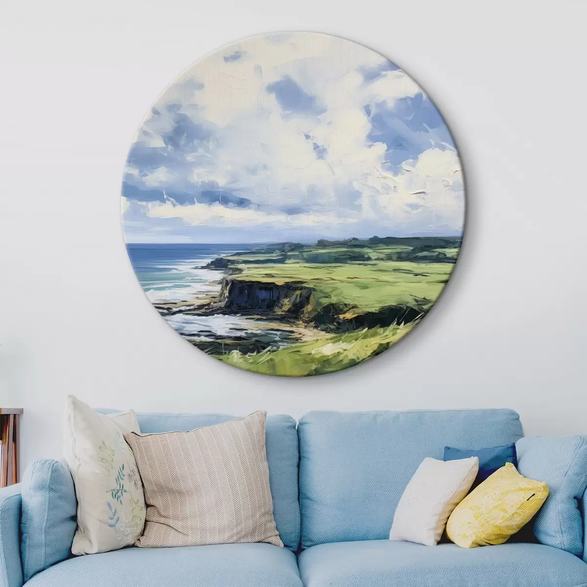Obrázok Zelené pole s útesom na pobreží, modré more s vlnami, zamračená obloha, minimalistická imitácia modernej olejomaľby Nr r43406