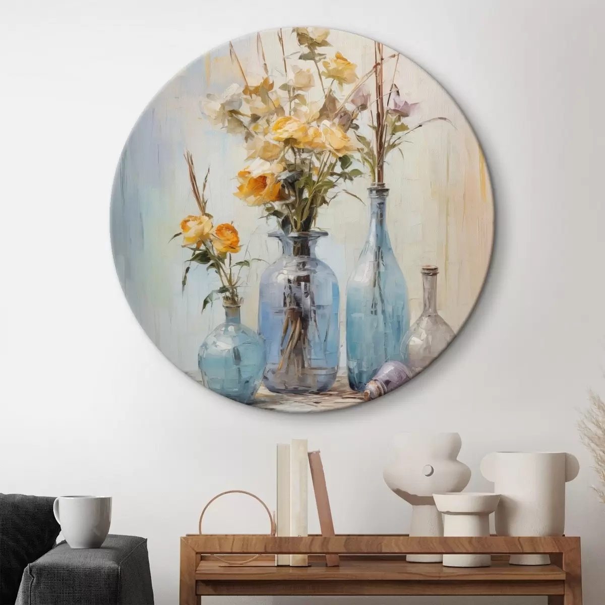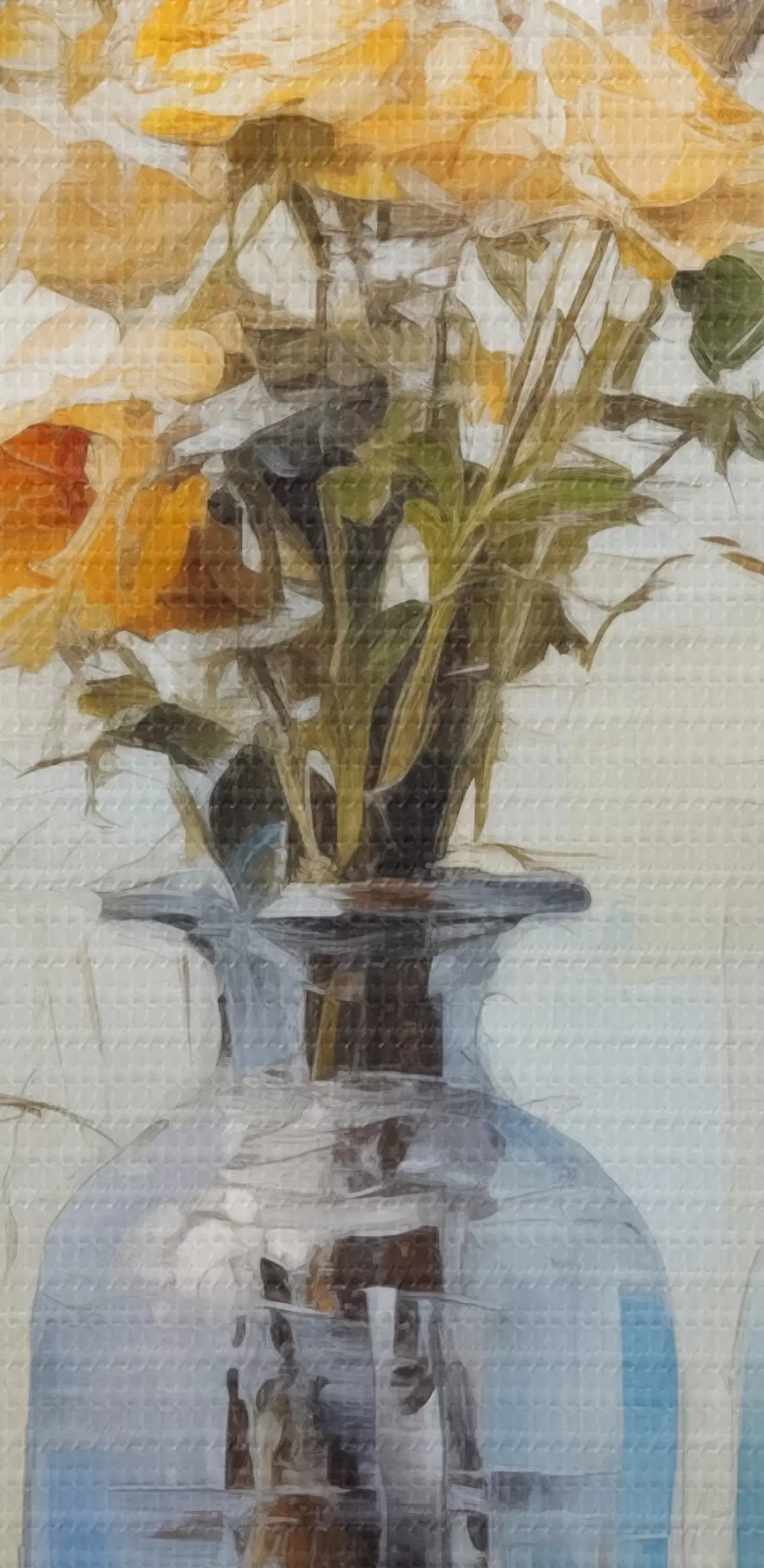 Obrázok Zátišie so žltými ružami v modrých sklenených vázach, ľahká textúra pozadia, jemné ťahy štetcom, štýl olejomaľby Nr r43409