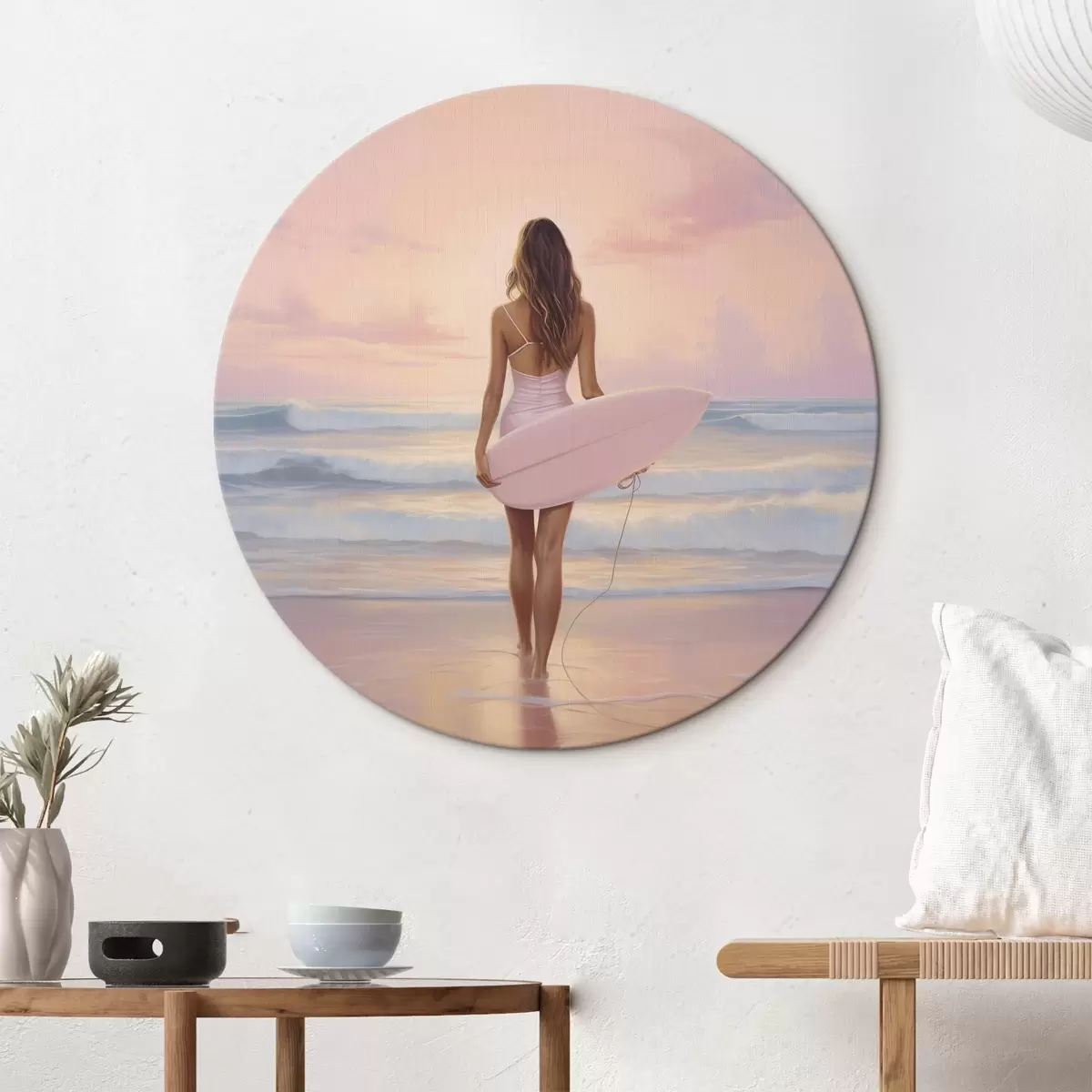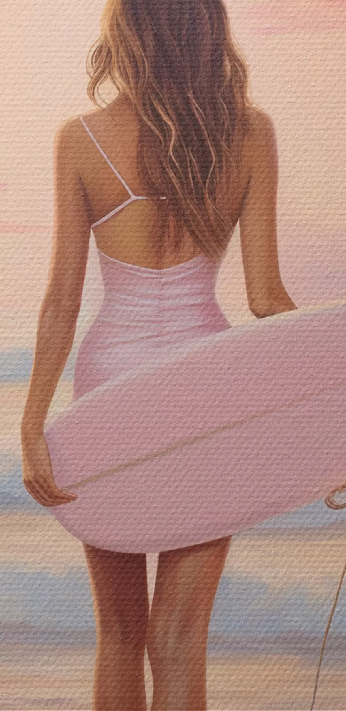 Obrázok Dievča so surfom na pláži oceánu, západ slnka, akrylová kresba Nr r43881