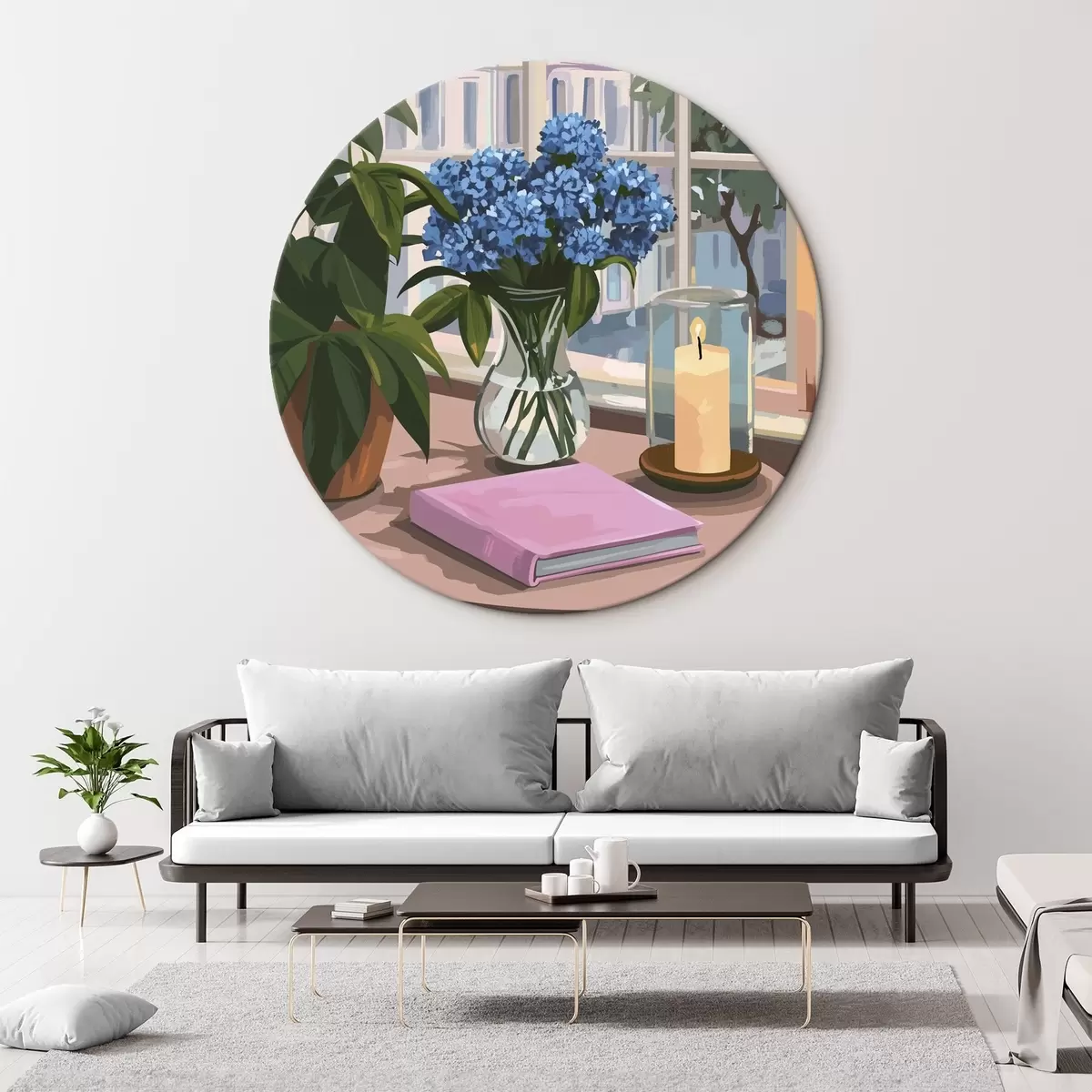 Obrázok Hortenzie vo váze, pohľad z okna, sviečka, útulný domov Nr r44009