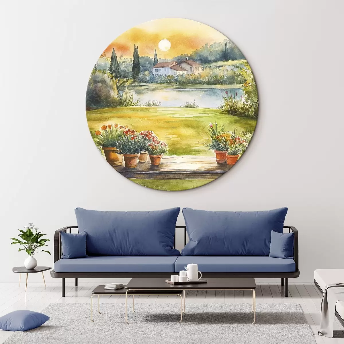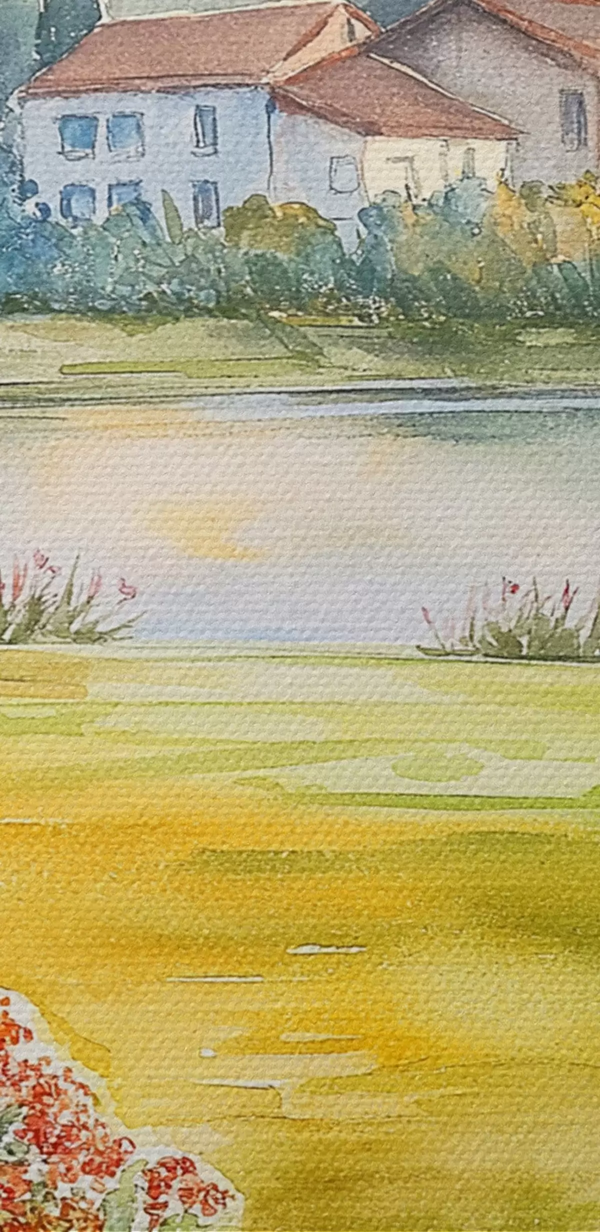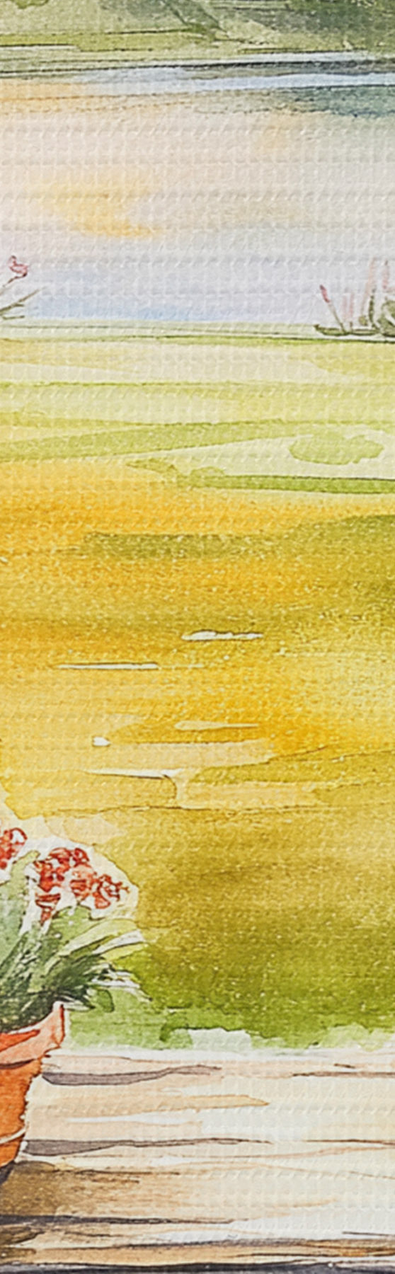 Obrázok Dedina na západe slnka, rustikálne, letné kvety, jazero, akvarel Nr r44016