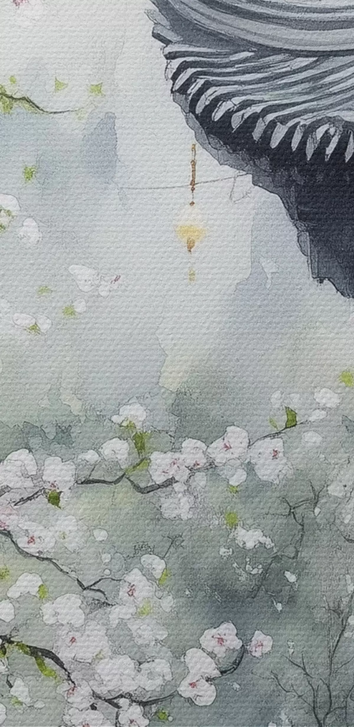 Obrázok Japonská záhrada s čerešňou a domom, orientálny, akvarelový štýl Nr r44309