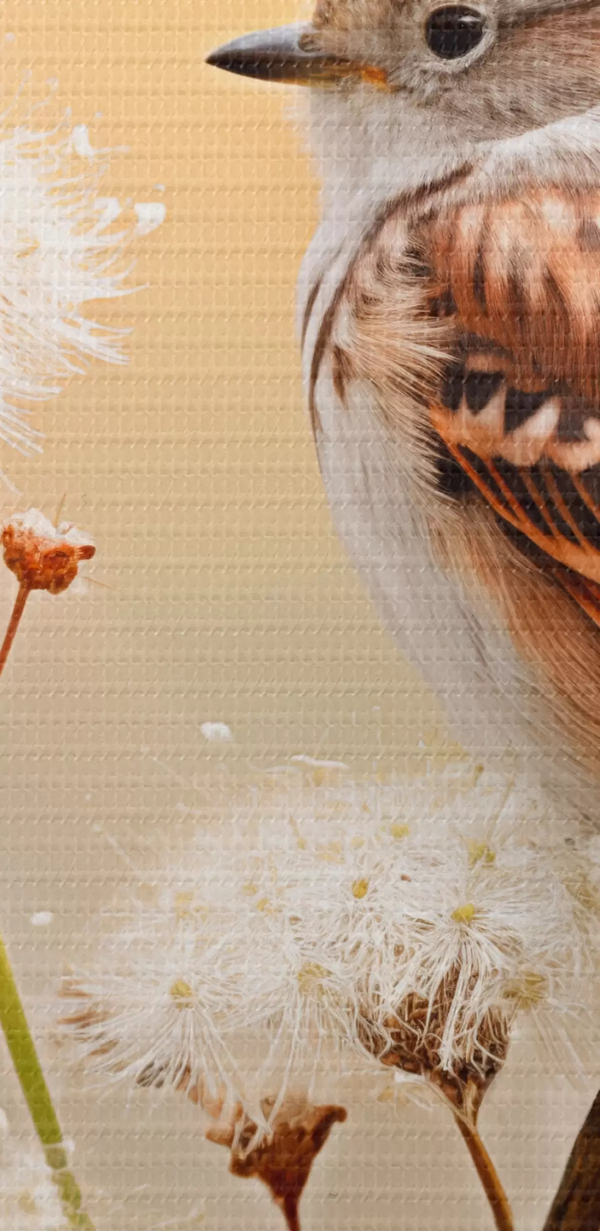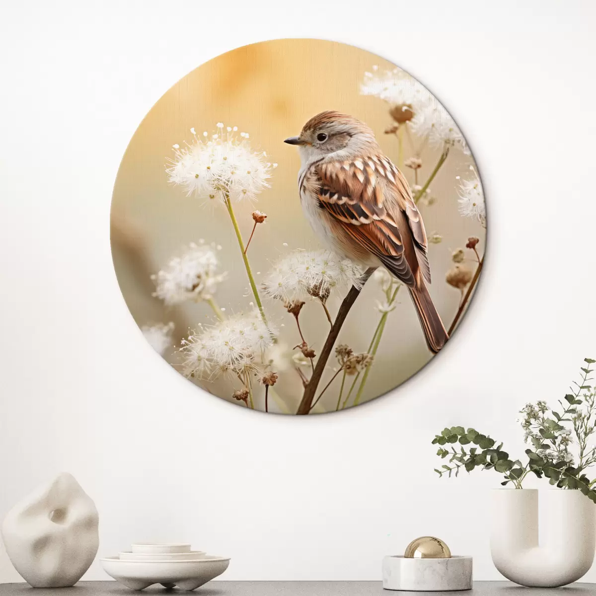 Obrázok Vták sediaci na vetve s bielymi kvetmi, mäkké zaostrenie, prírodné pozadie Nr r44393