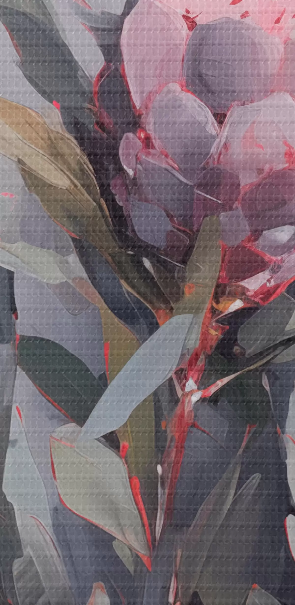 Obrázok Ružové kvety protey so zelenými listami, jemné ťahy štetcom, tmavé farby, elegantné zloženie Nr r44400