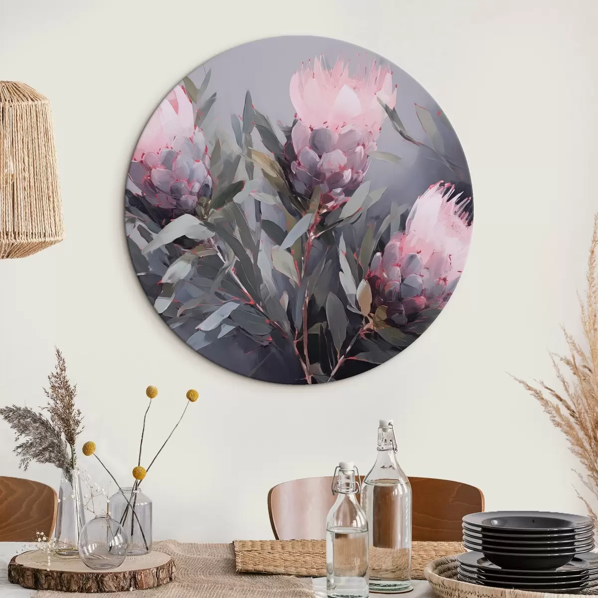 Obrázok Ružové kvety protey so zelenými listami, jemné ťahy štetcom, tmavé farby, elegantné zloženie Nr r44400