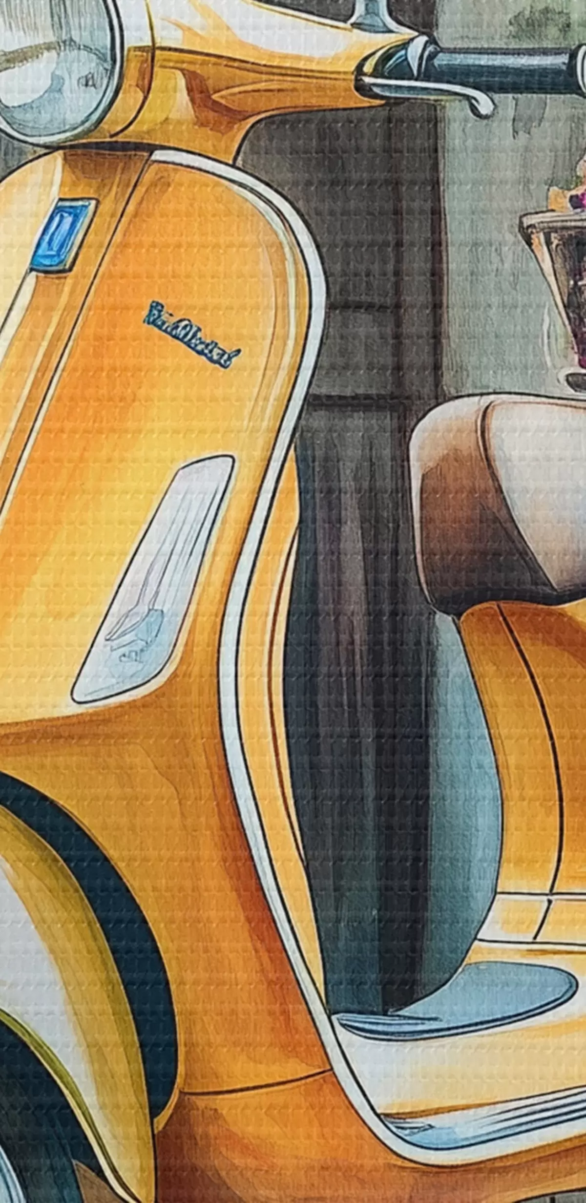 Obrázok Žltý skúter Vespa pri drevených dverách s kvetmi Nr r44607
