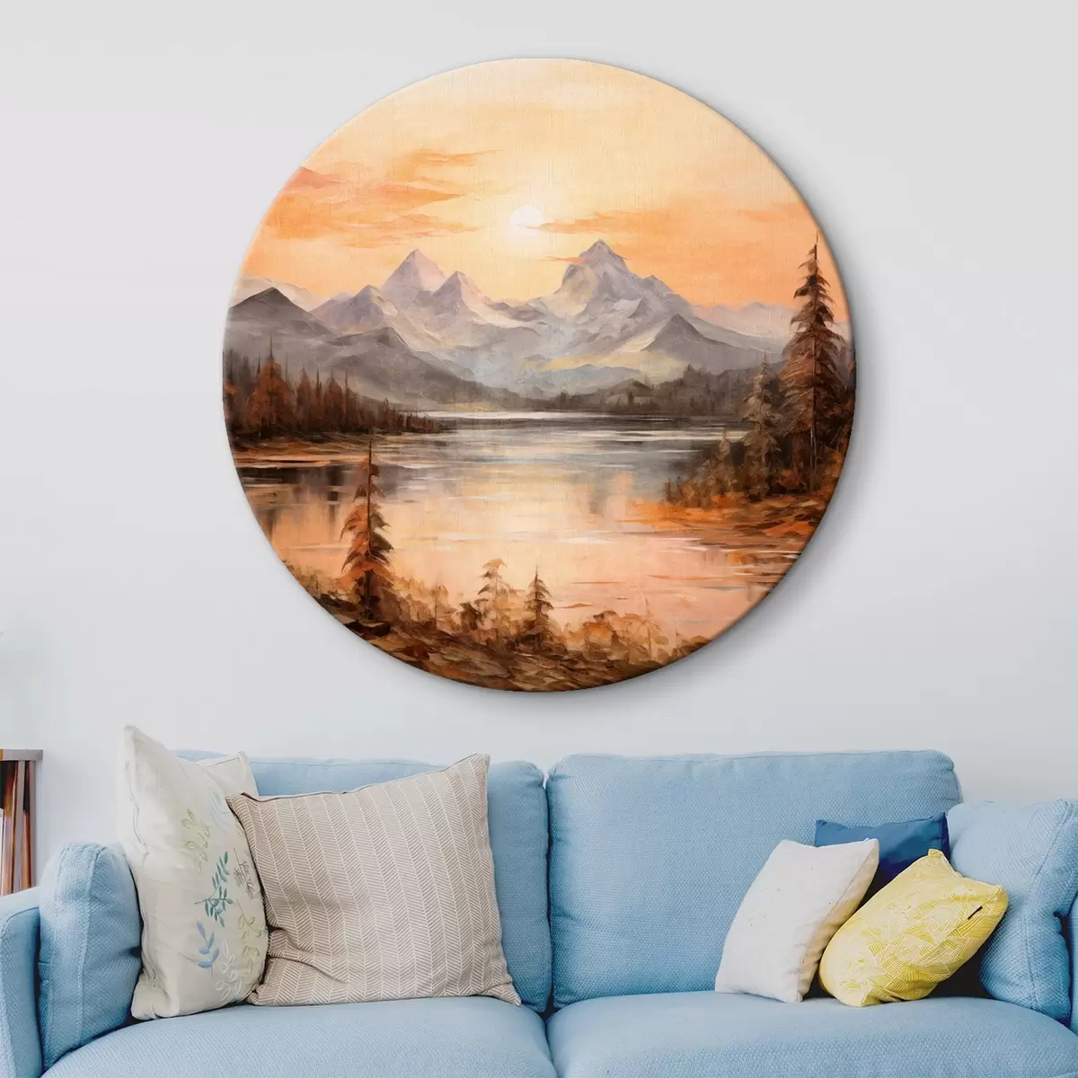 Obrázok Krajina s jazerom obklopeným stromami a horami v pozadí, oranžová obloha so slnkom Nr r44857