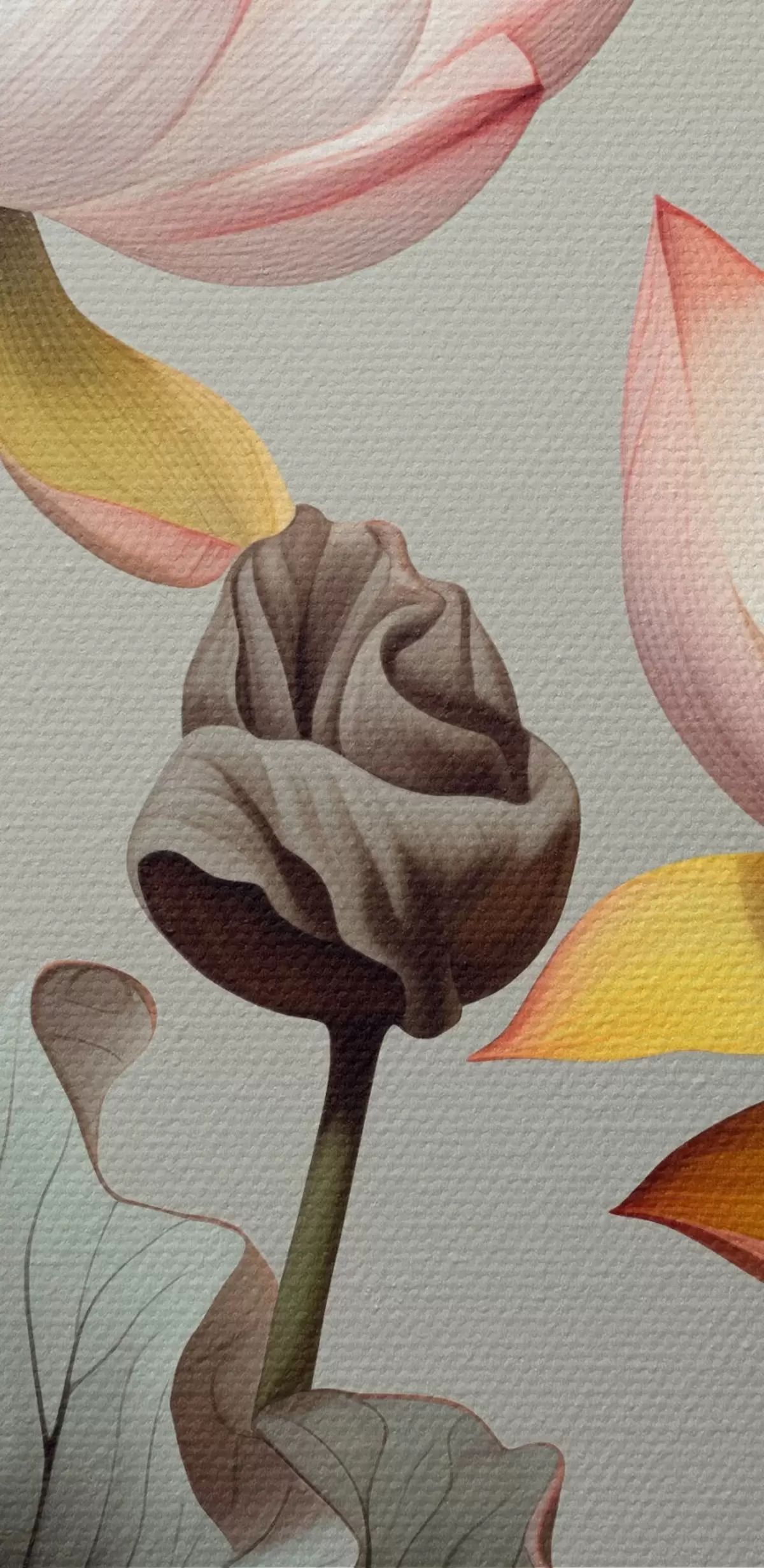 Obrázok Lotosové kvety s pastelovými okvetnými lístkami a zelenými listami v tlmenej farebnej palete na jednoliatom pozadí Nr r44862