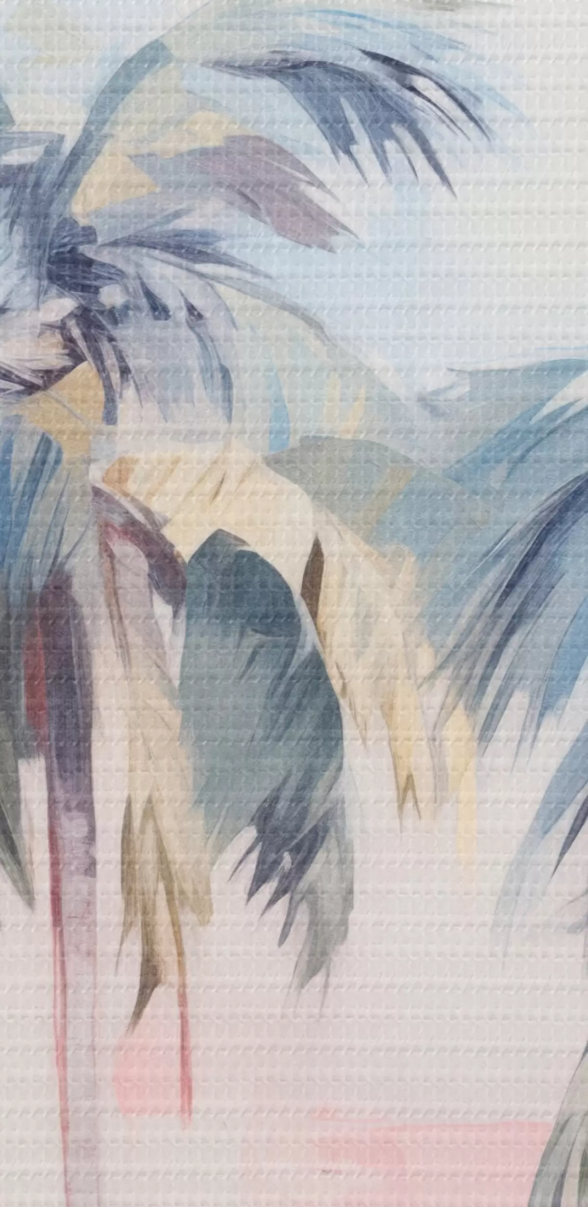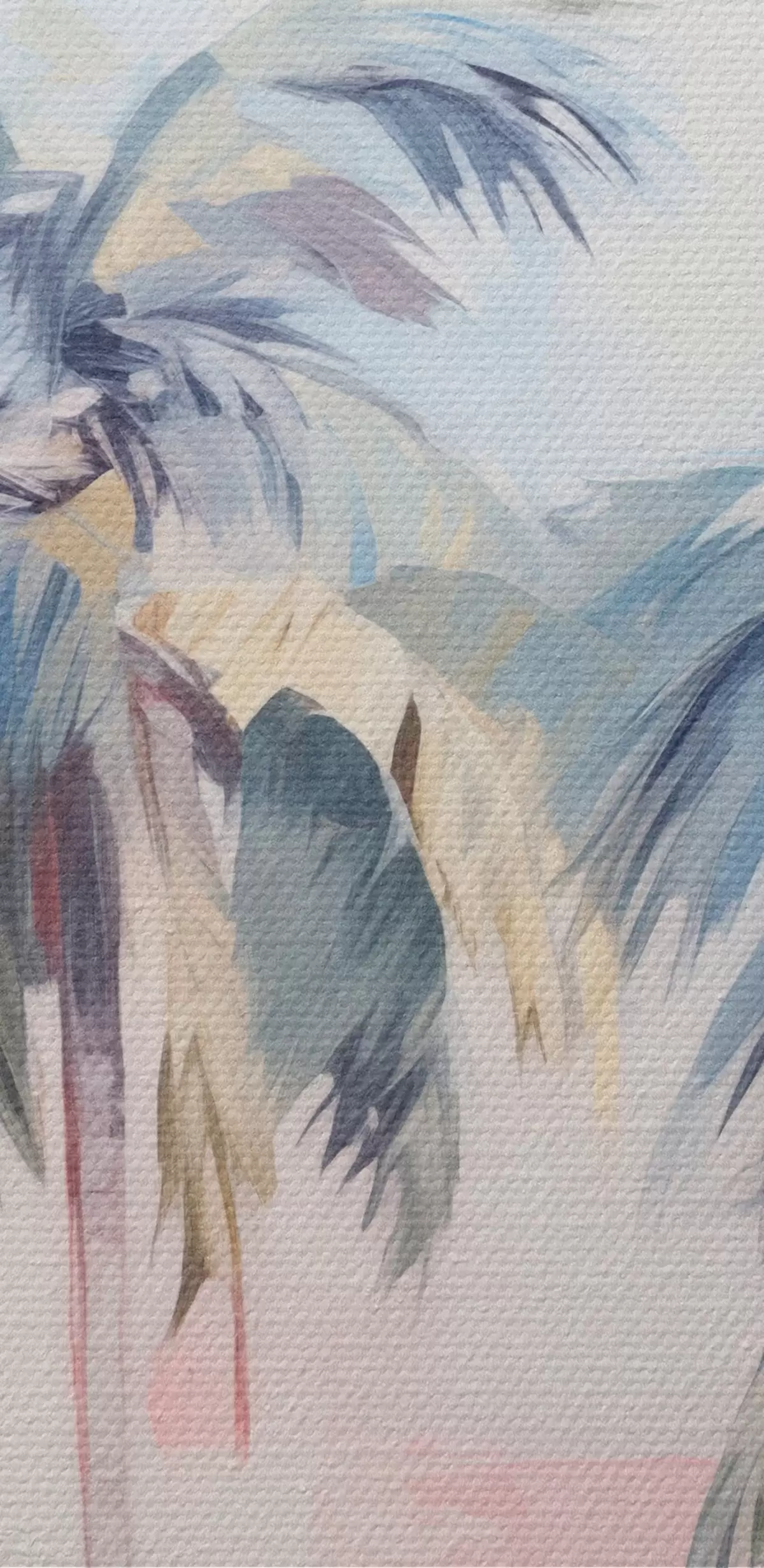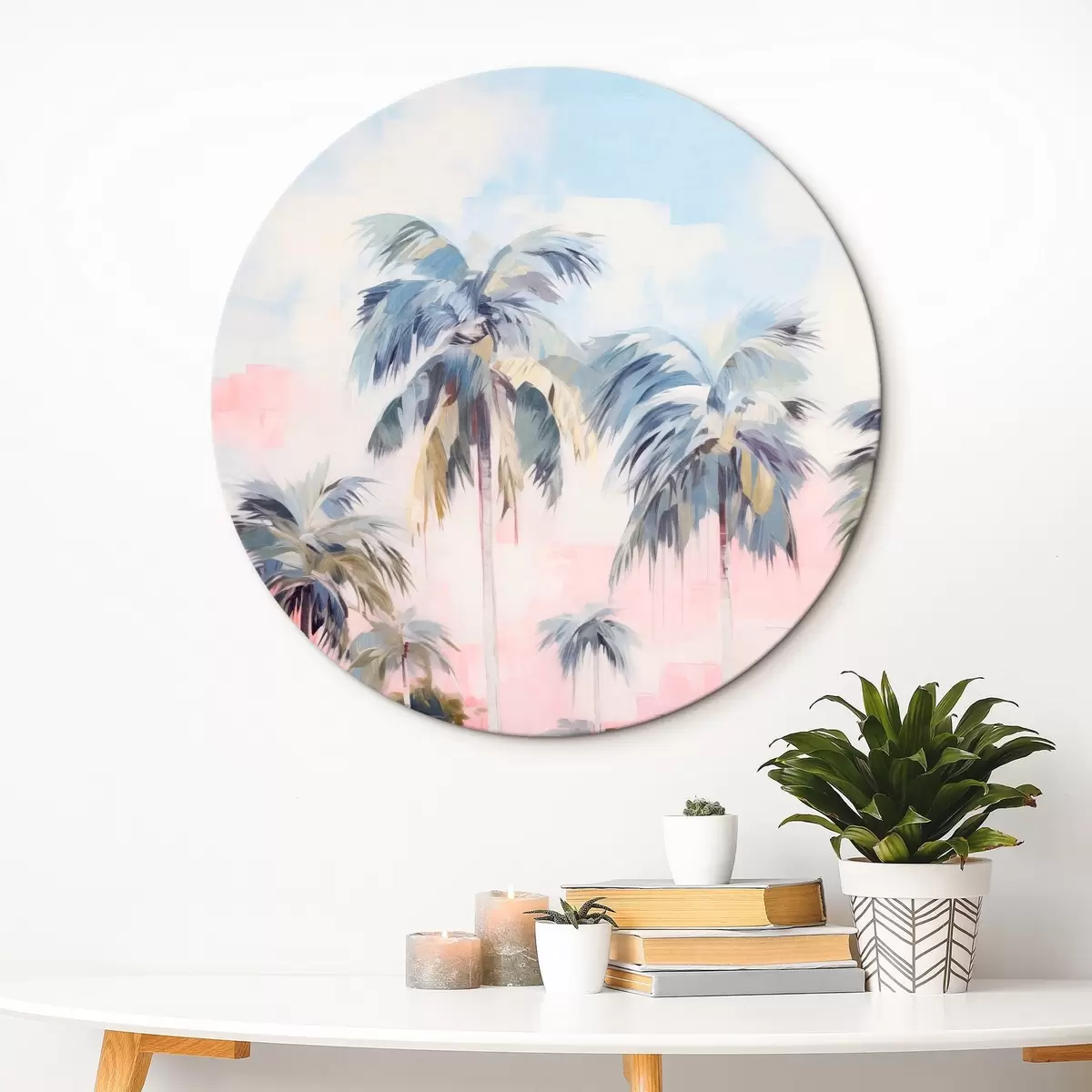 Obrázok Palmy s pastelovými listami a hnedými kmeňmi, ružová a modrá obloha, tropické prostredie Nr r44866