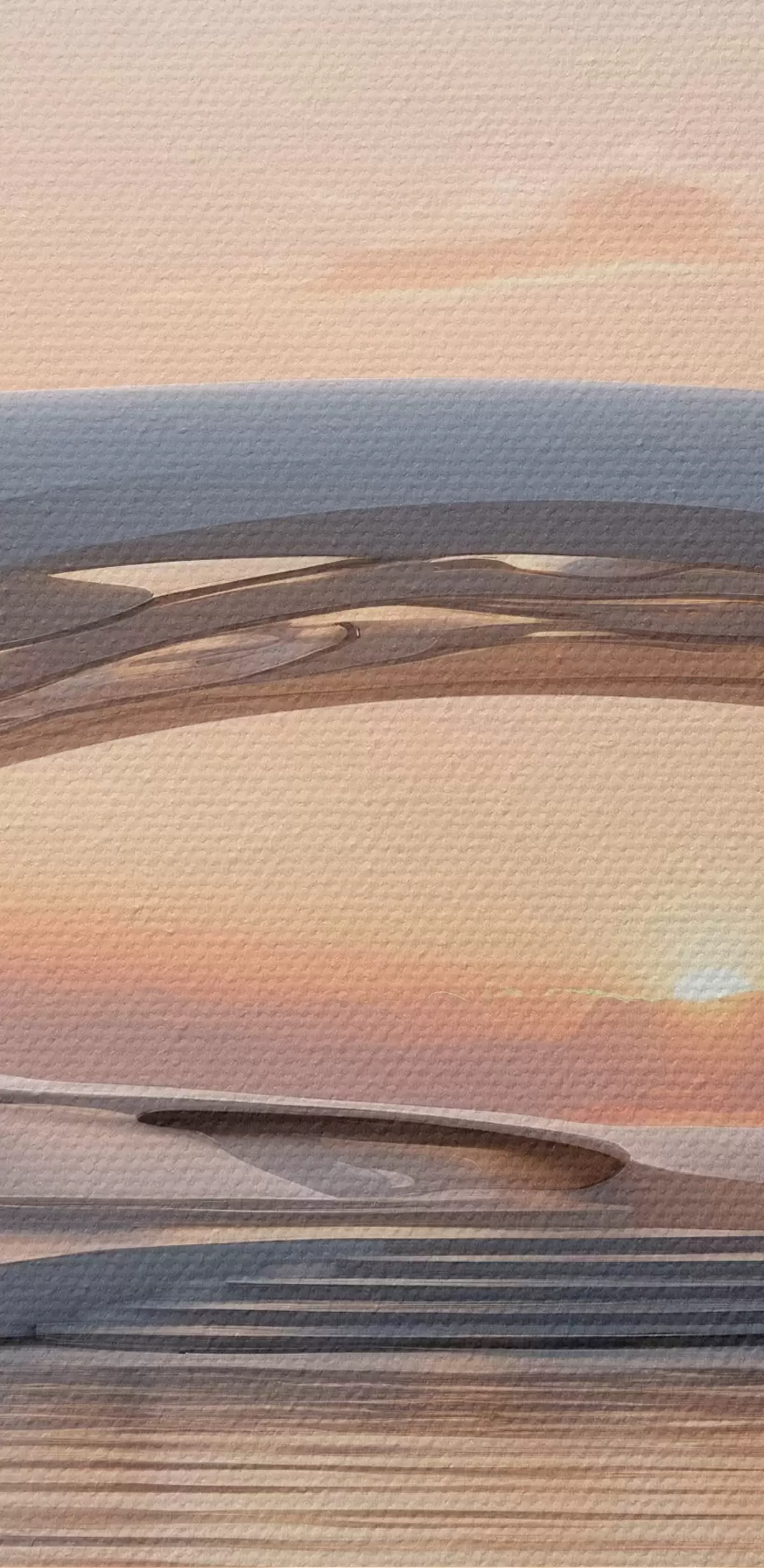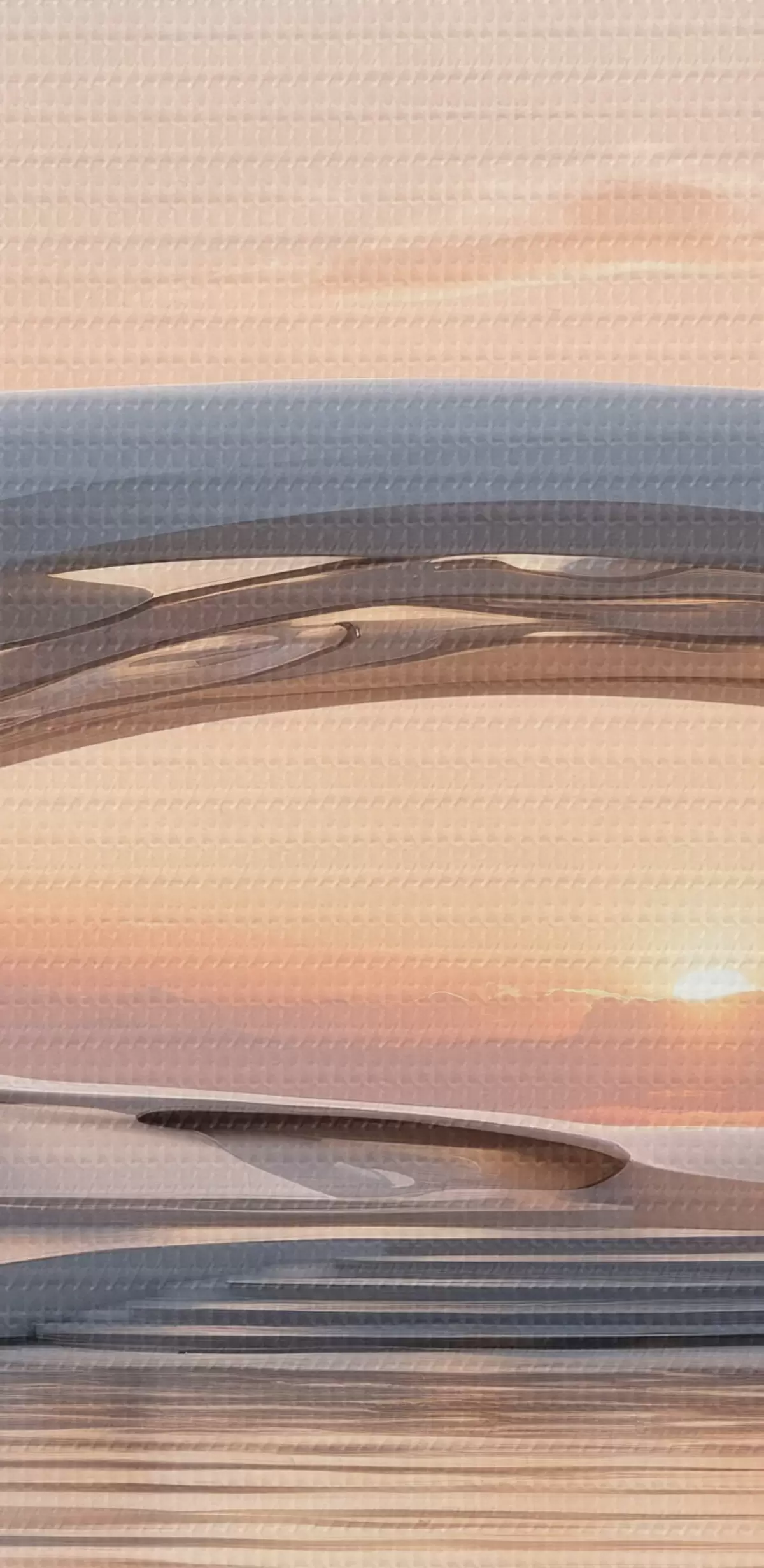 Obrázok Futuristická budova na vode na pozadí ružového západu slnka Nr r44884