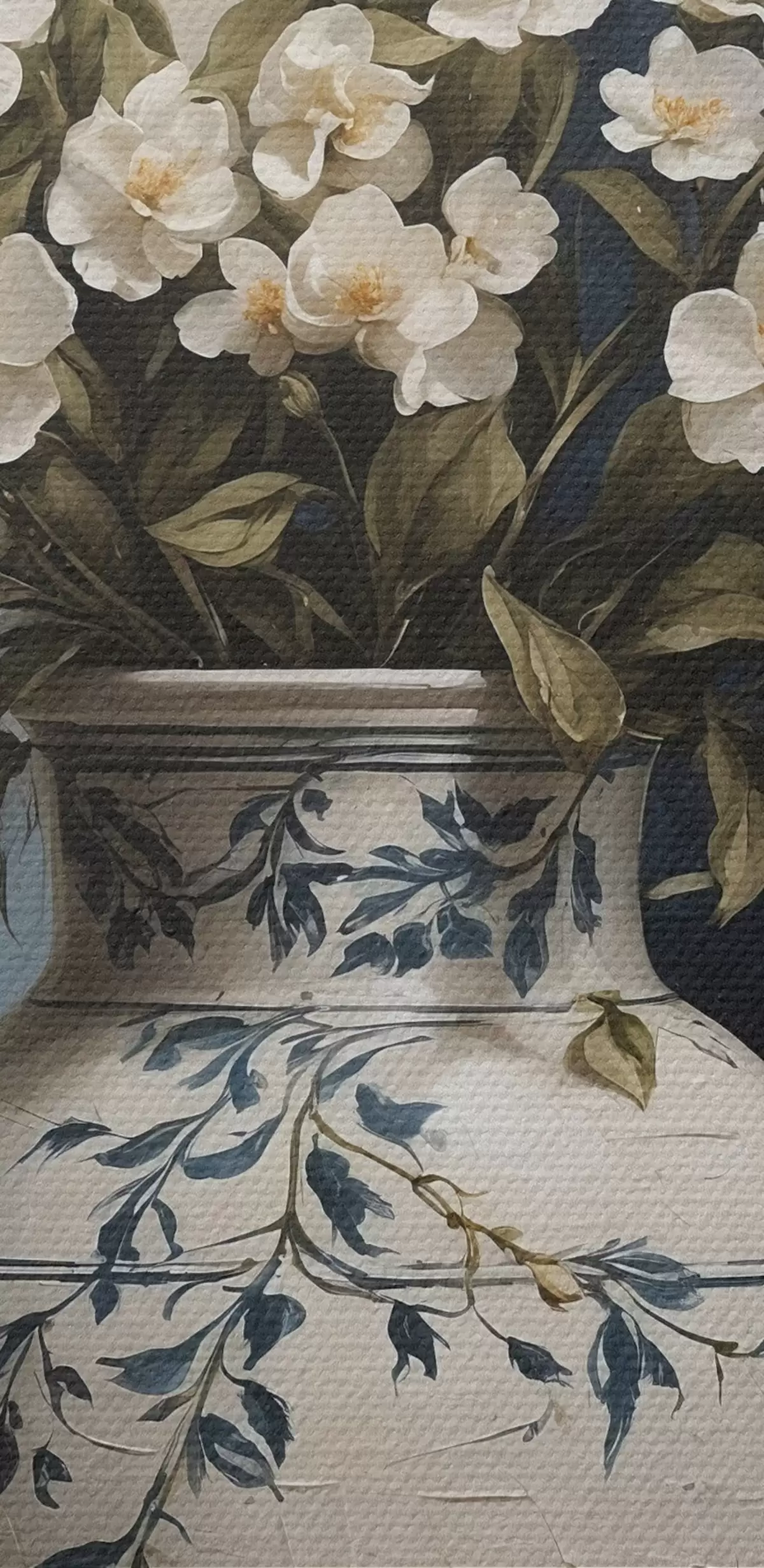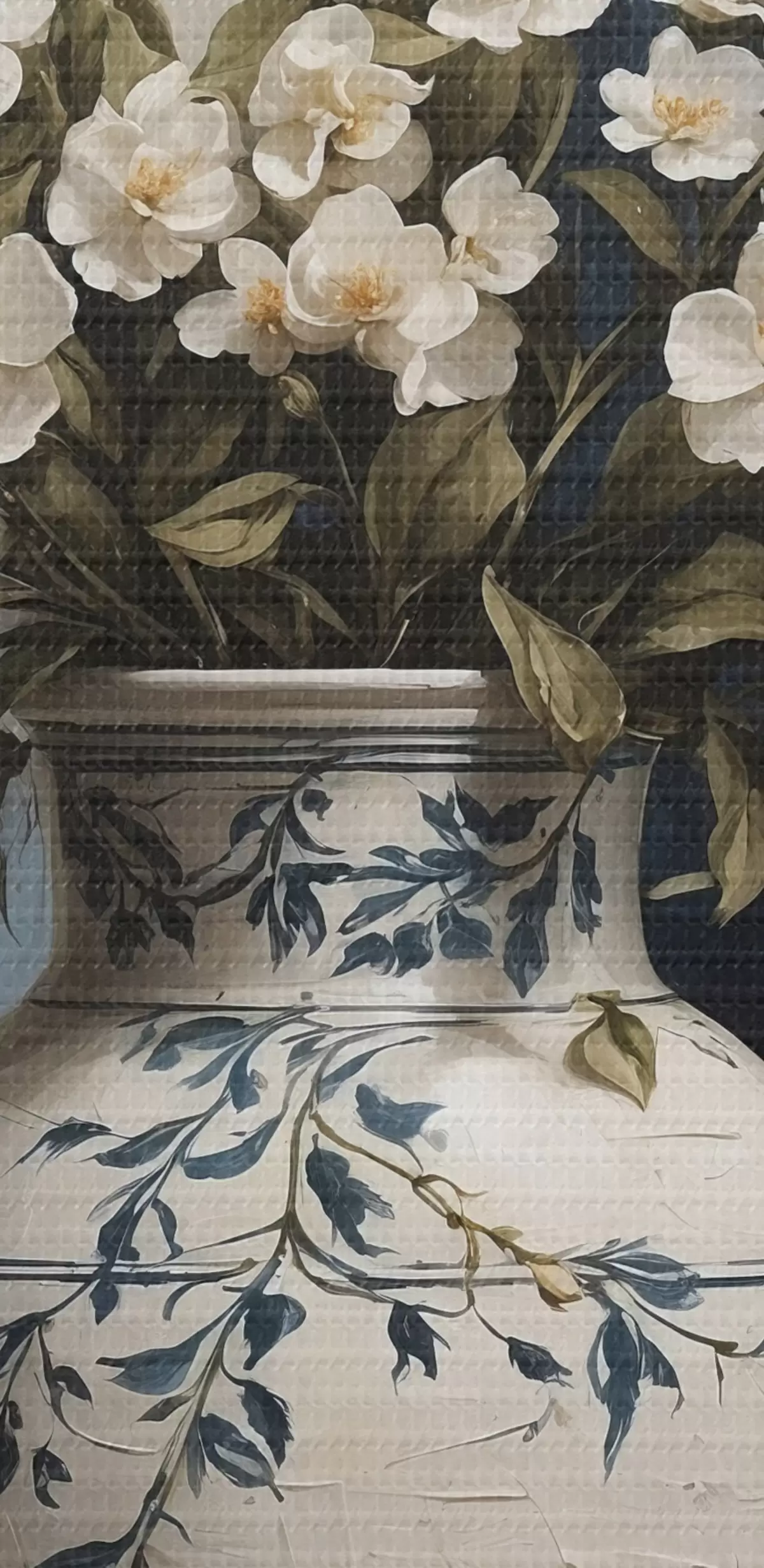 Obrázok Biele a žlté kvety vo veľkej váze na modrom pozadí Nr r44893