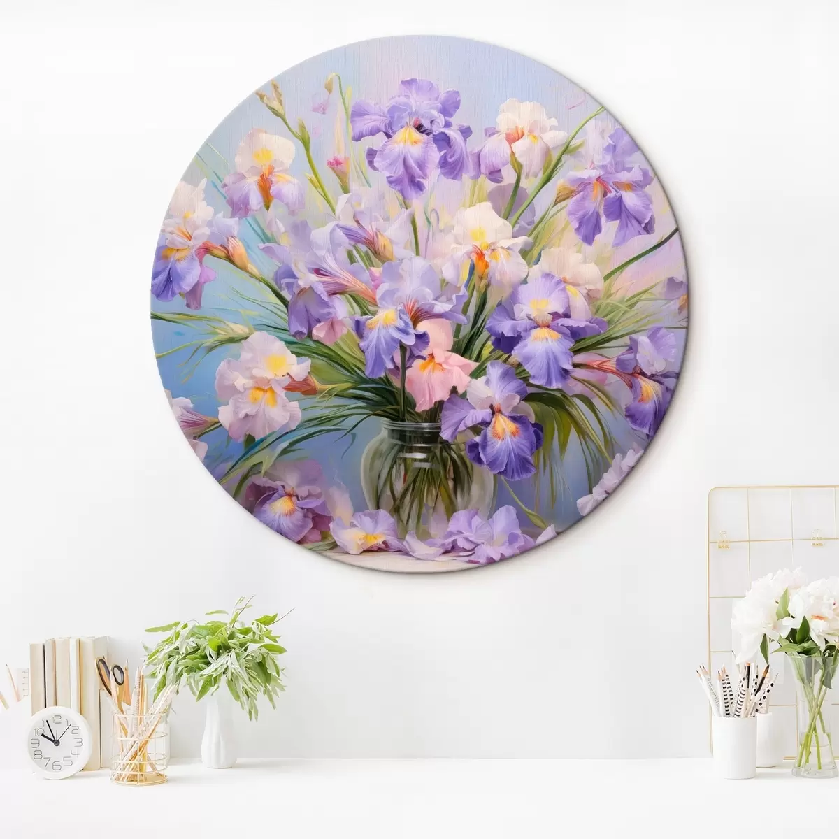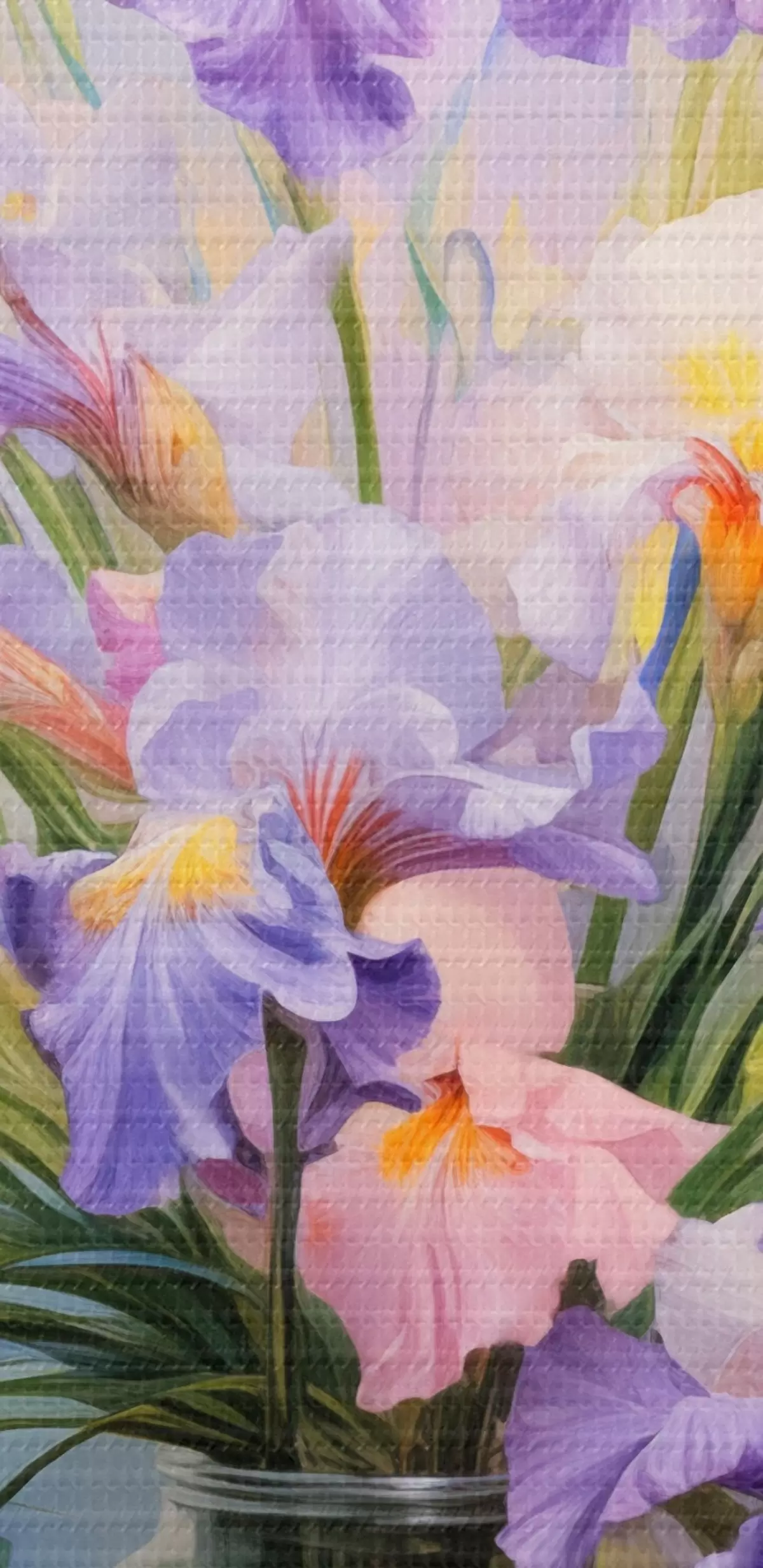 Obrázok Váza s množstvom pastelových kosatcov, niekoľko okvetných lístkov roztrúsených na stole, jemné pastelové pozadie s modrými a ružovými tónmi Nr r44933