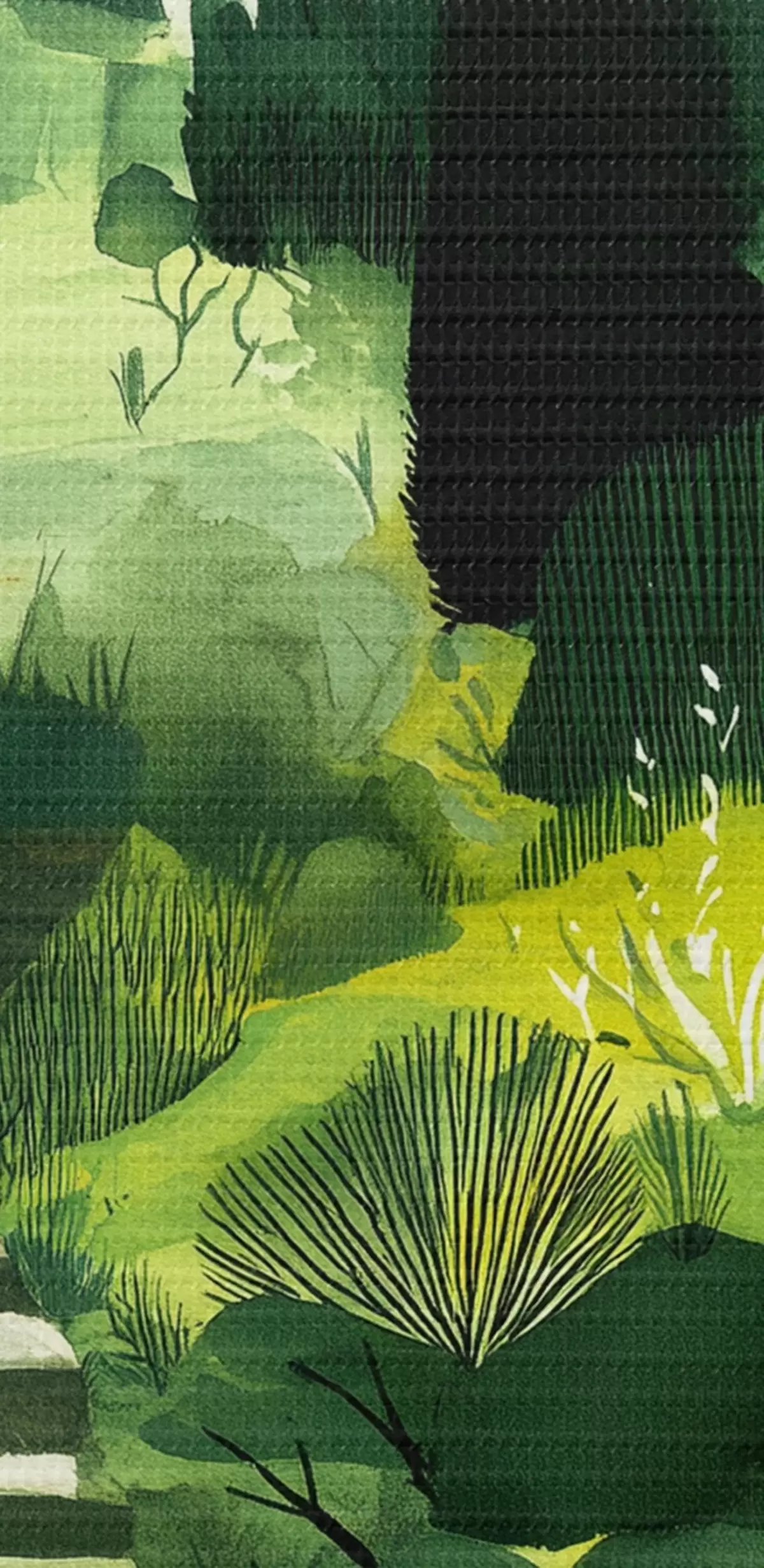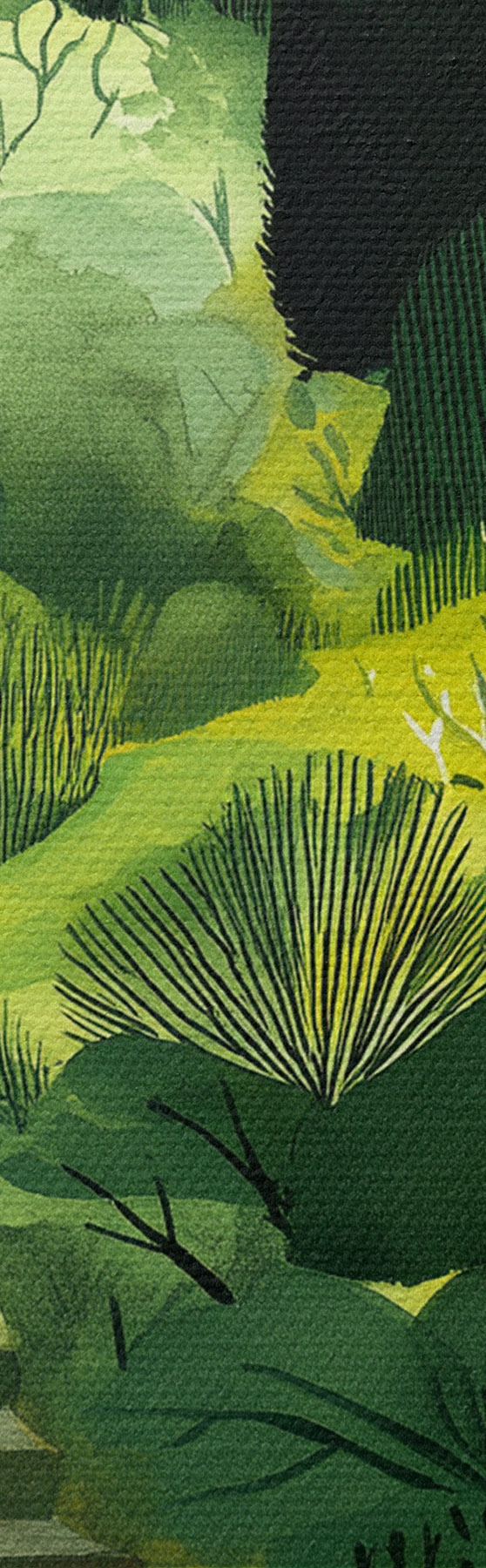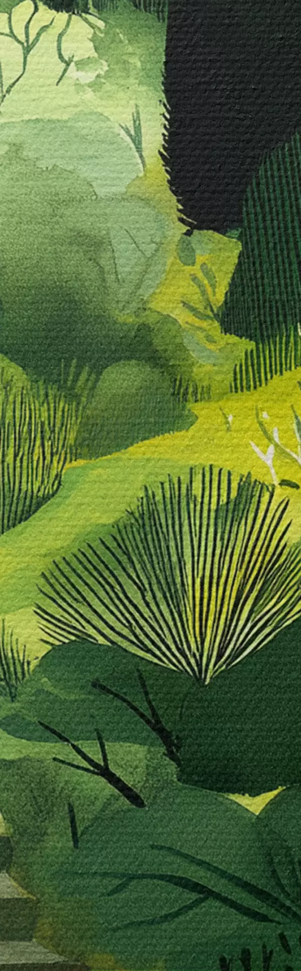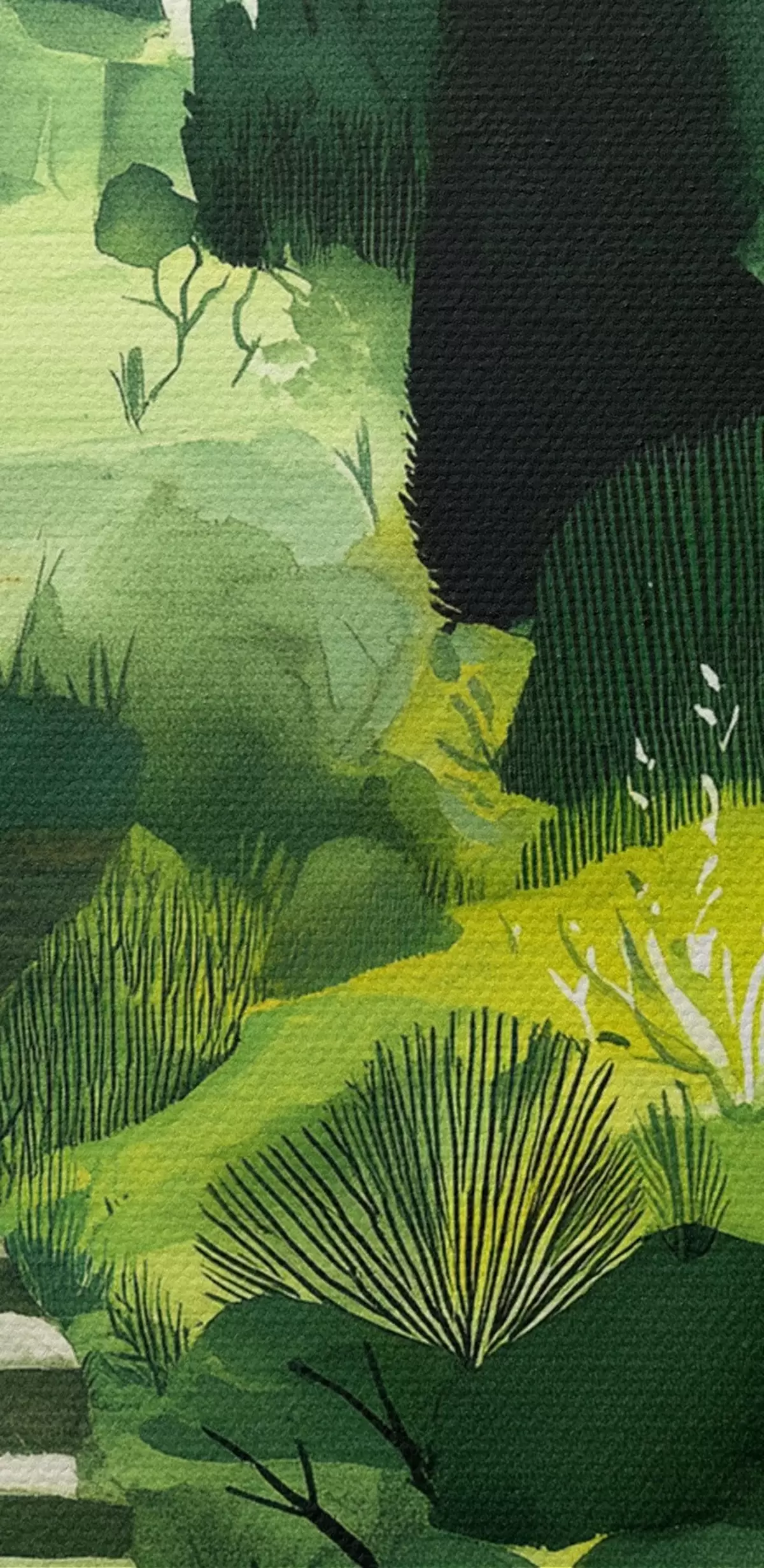 Obrázok Zelené kopce so stromami a kríkmi, betónové schody, svieže farby Nr r44980