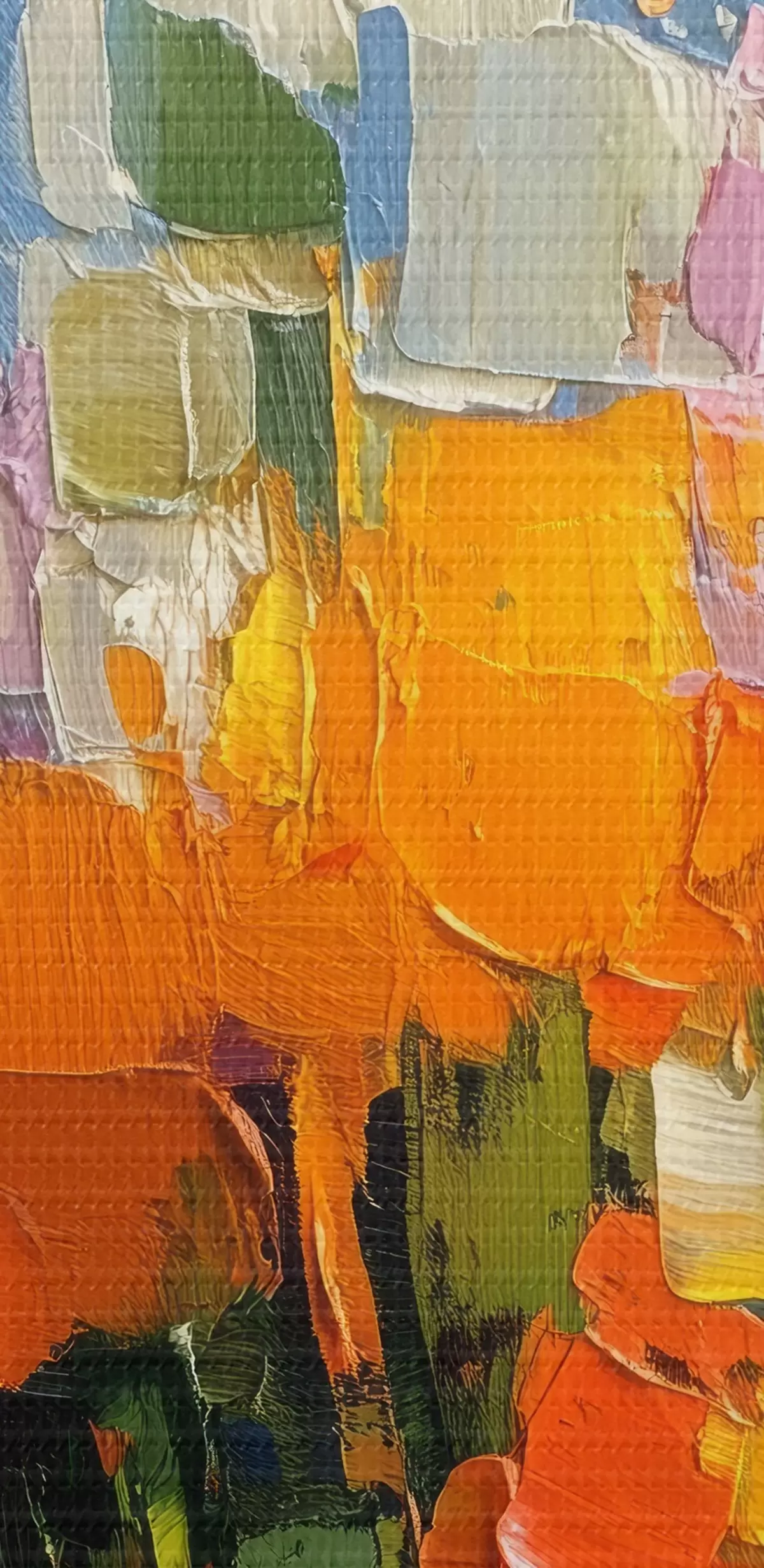 Obraz je možné zavesiť ihneď po jeho prevzatí. Obraz bude napnutý na drevených nosidlách so šírkou 2 cm.