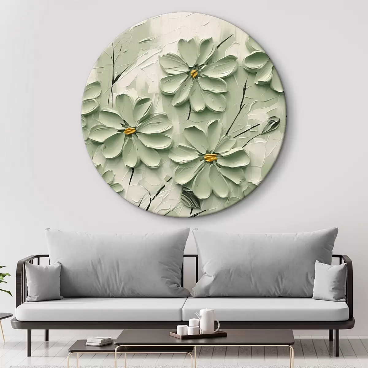 Obrázok Zelené kvety so žltými stredmi namaľované hustými ťahmi štetca na svetlom pozadí Nr r45265