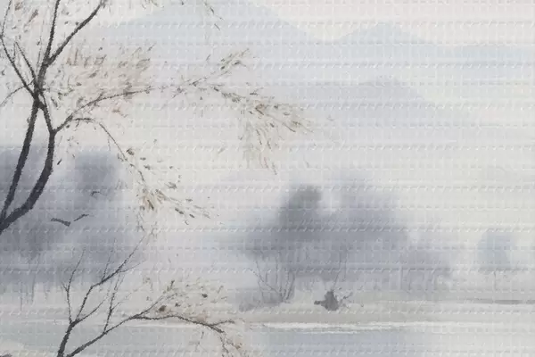Obrázok Hmlistá krajina so stromom, horami a vtákmi Nr r45518