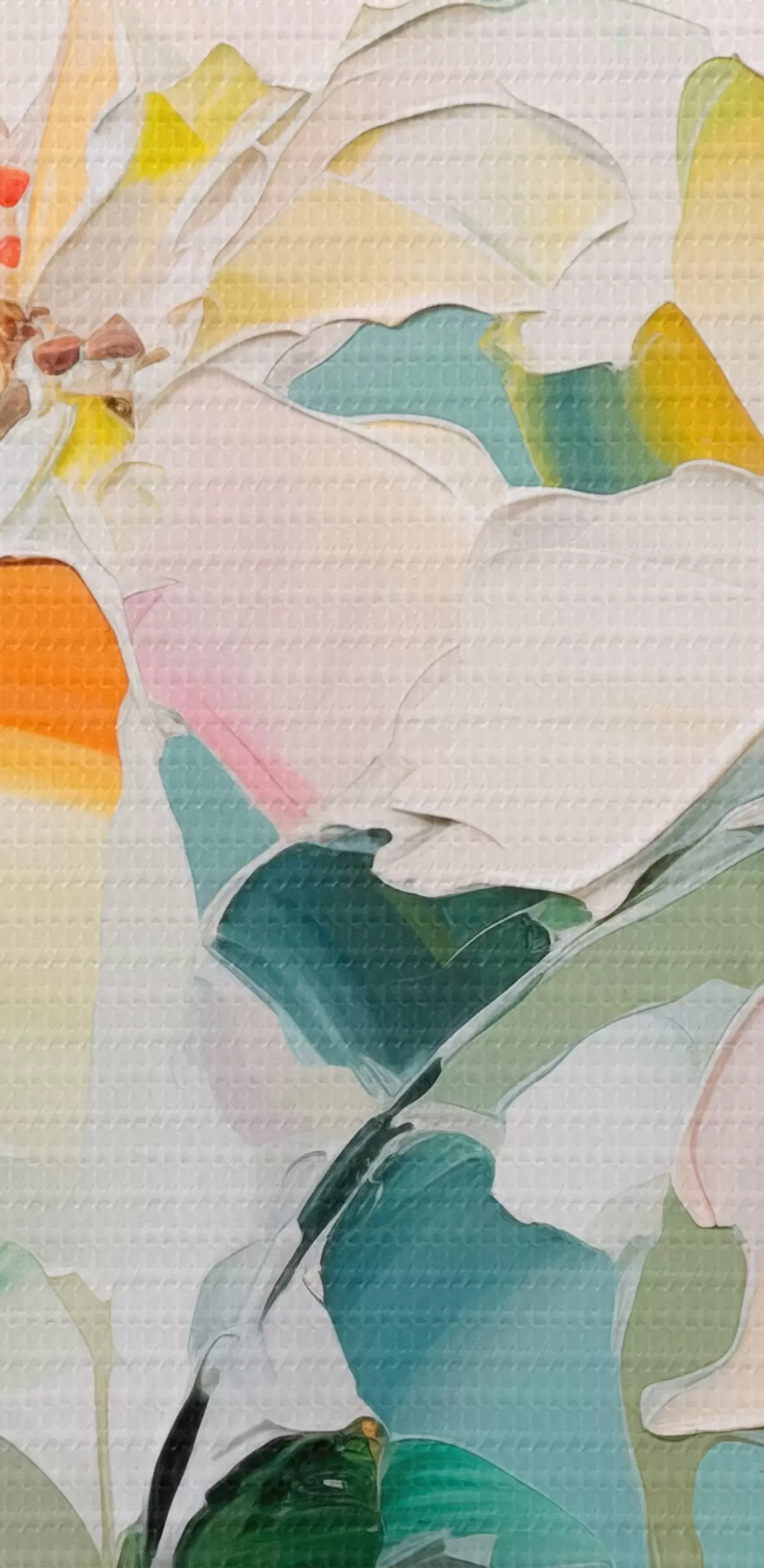 Obrázok Kvety s farebnými akcentmi, zelené listy, jemné ťahy štetcom imitácia olejomaľby, svetlomodré pozadie Nr r45549
