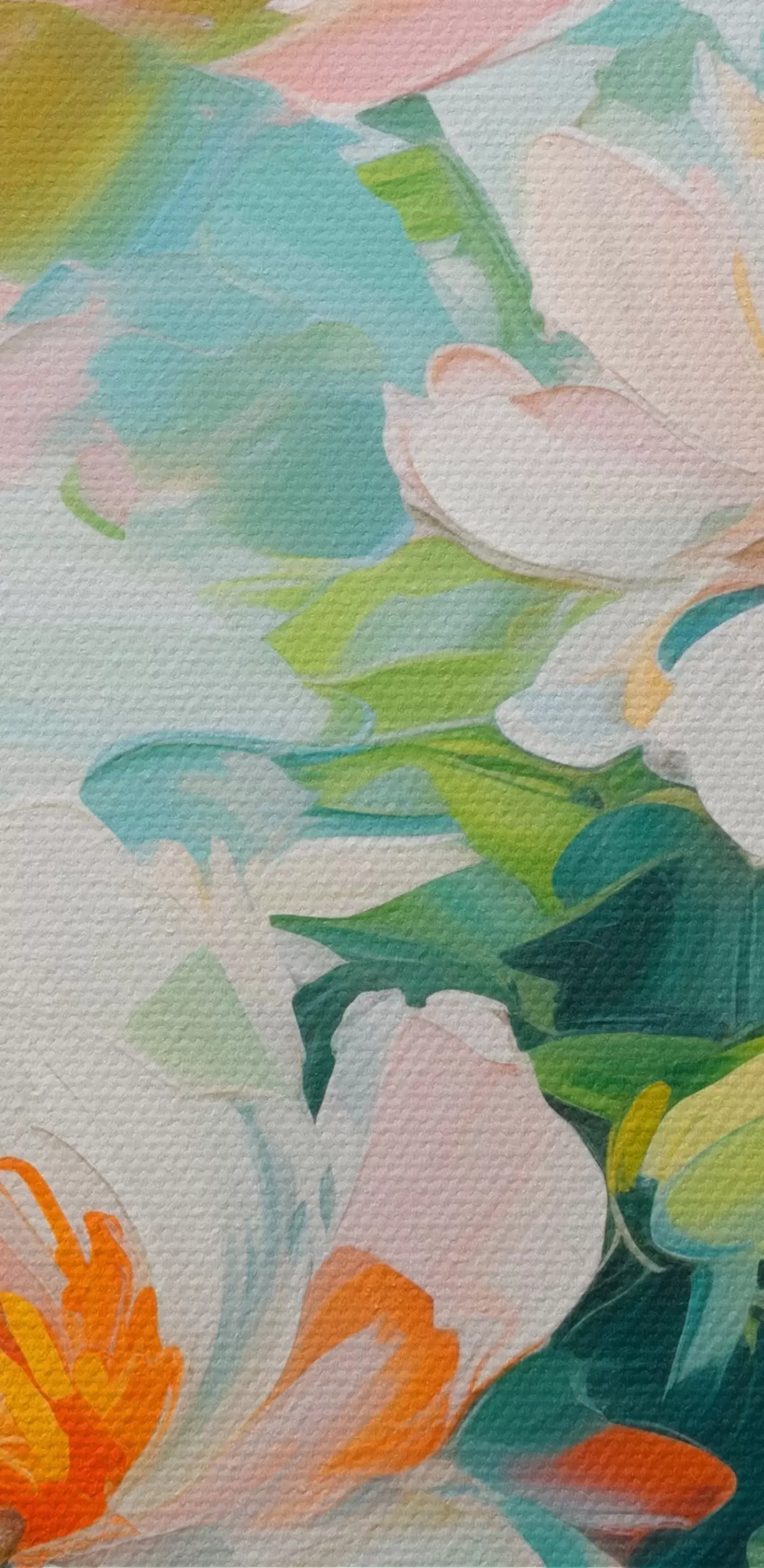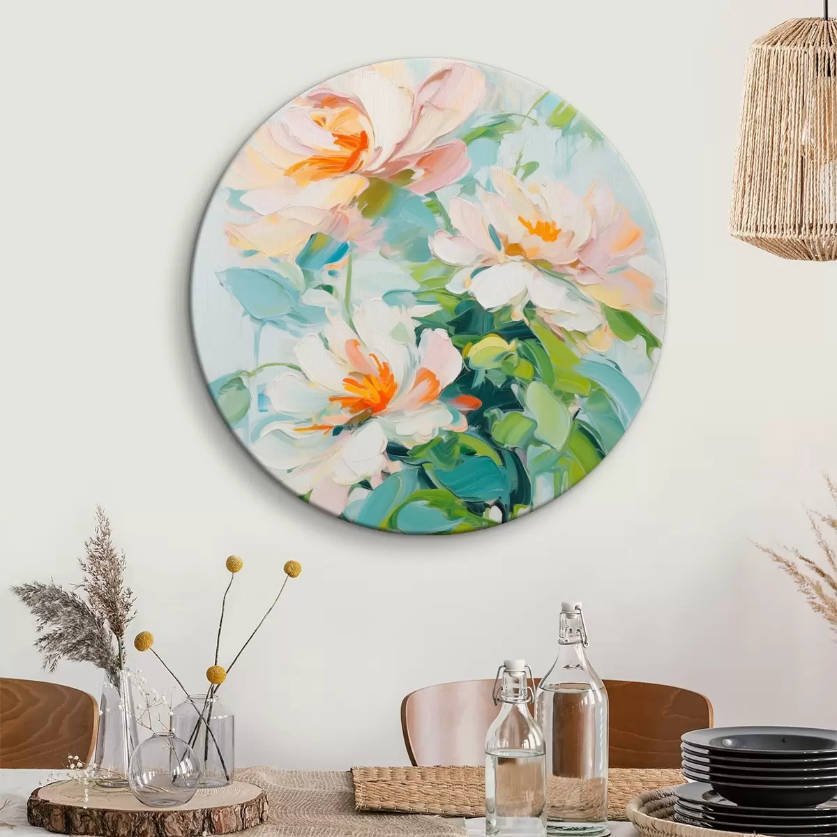 Obrázok Biele a pastelové broskyňové kvety, zelené listy, jemné ťahy štetcom imitácia olejomaľby, svetlomodré pozadie Nr r45550