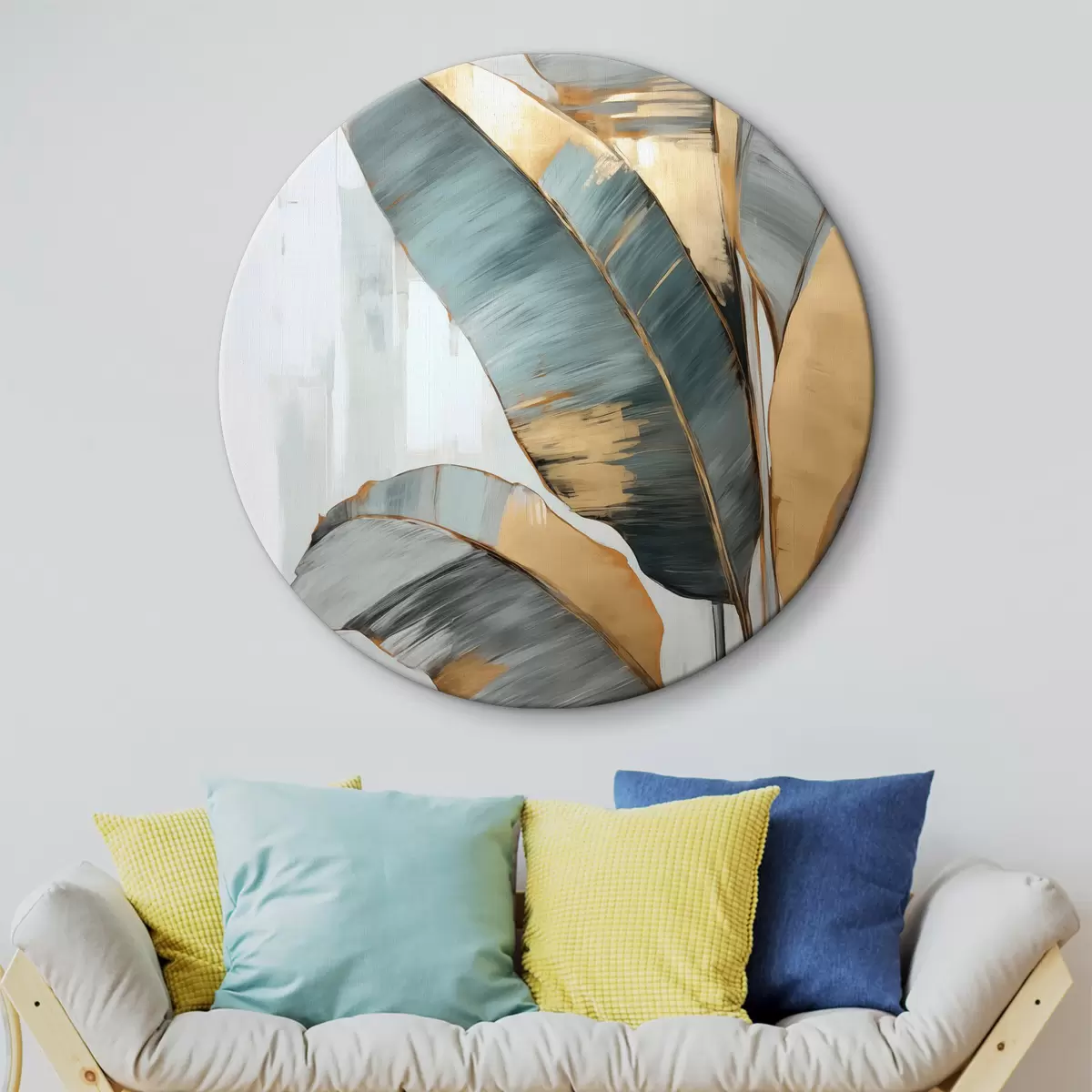Obrázok Súbor tlmených modrých, sivých a žltých banánových listov s viditeľnými ťahmi štetca na bielom abstraktnom pozadí Nr r45551