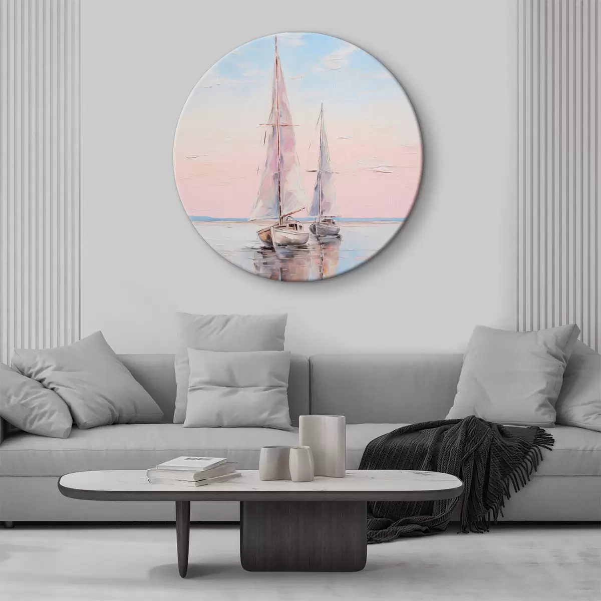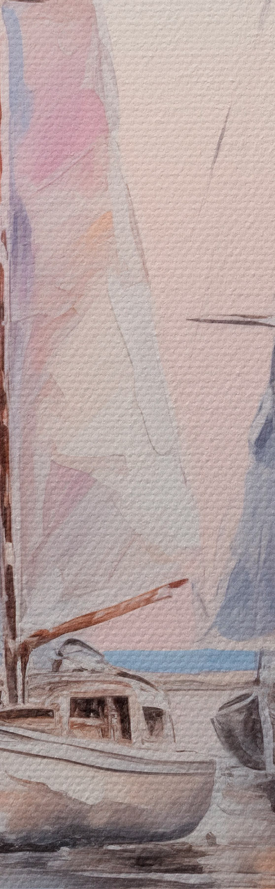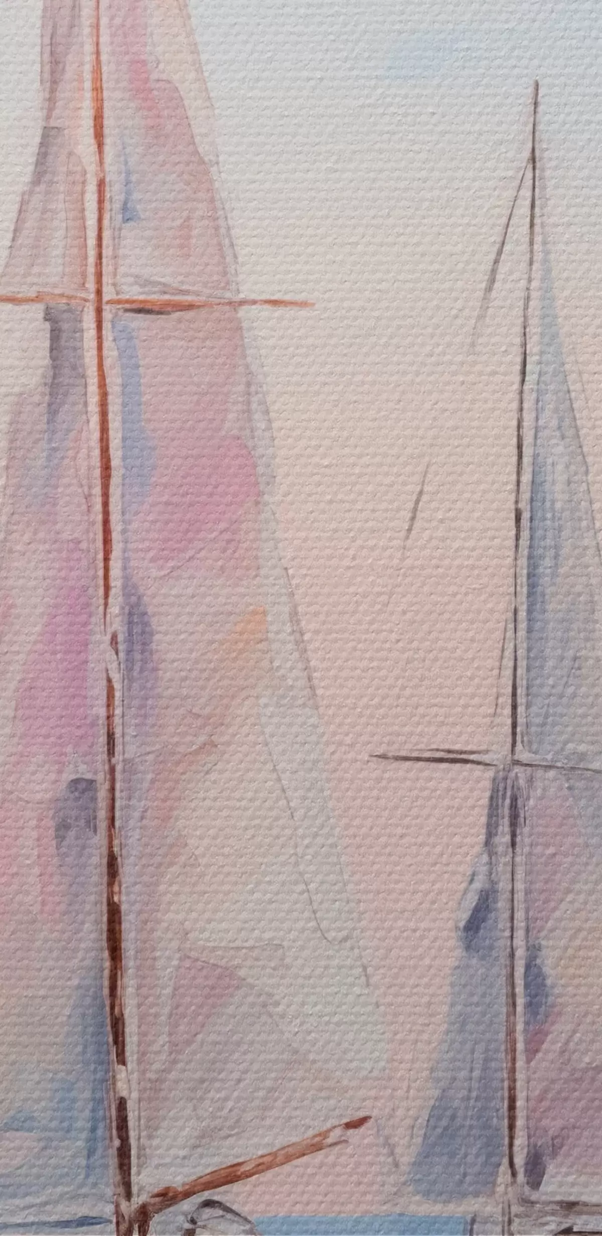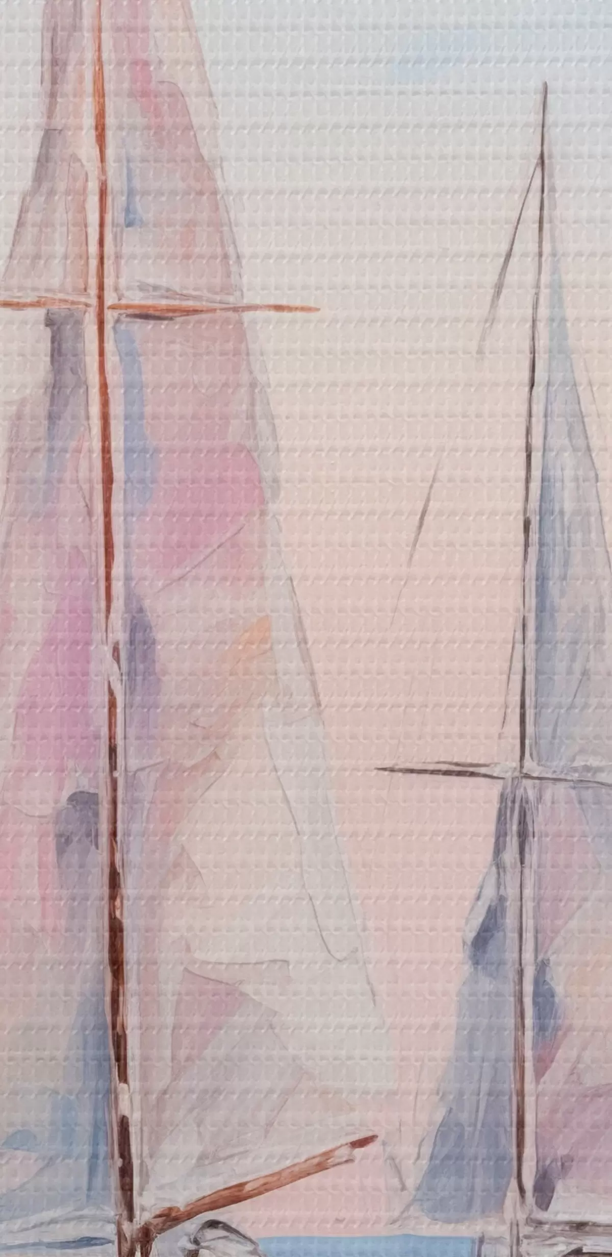 Obrázok Plachetnice s ružovými plachtami plávajúce na pokojnom mori, odrazy lodí vo vode, jemné pastelové farby Nr r45558