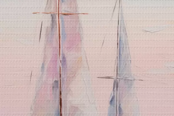 Obrázok Plachetnice s ružovými plachtami plávajúce na pokojnom mori, odrazy lodí vo vode, jemné pastelové farby Nr r45558