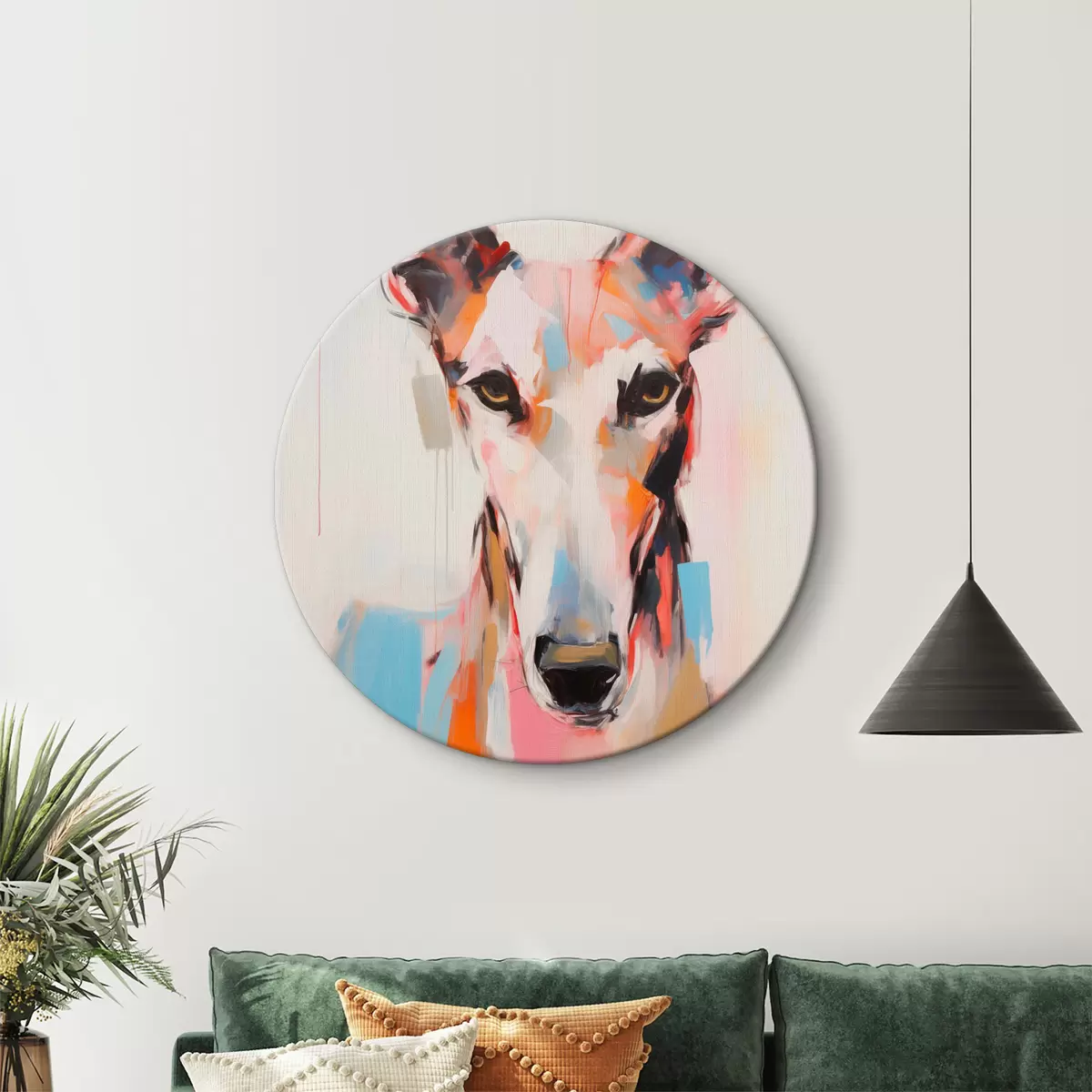 Obrázok Chrtí pes namaľovaný žiarivými farbami, ako je oranžová, ružová a modrá, na obyčajnom bielom pozadí Nr r45565