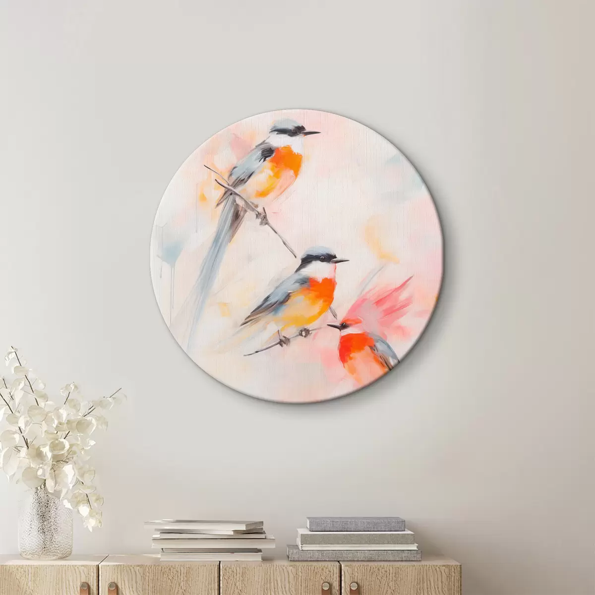 Obrázok Vtáky sediace na konároch , jemné pastelové farby, svetlé pozadie s ružovými a bielymi odtieňmi Nr r45577