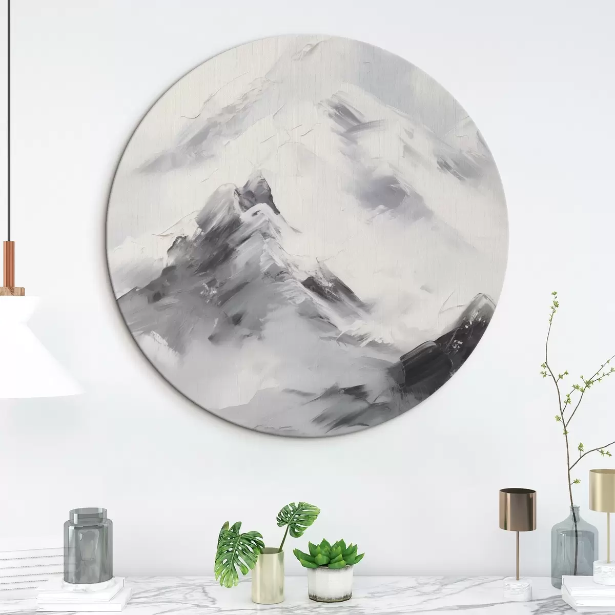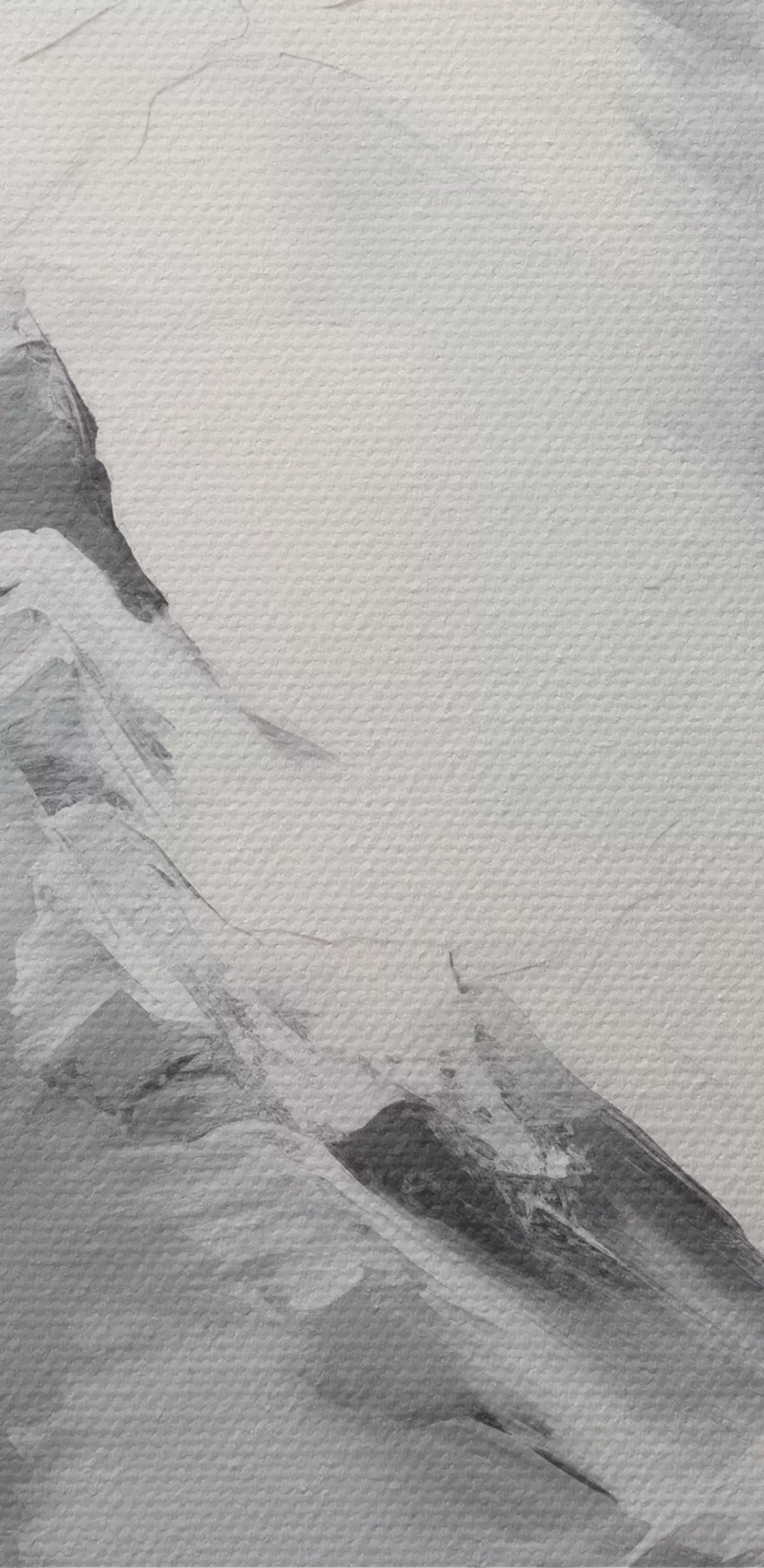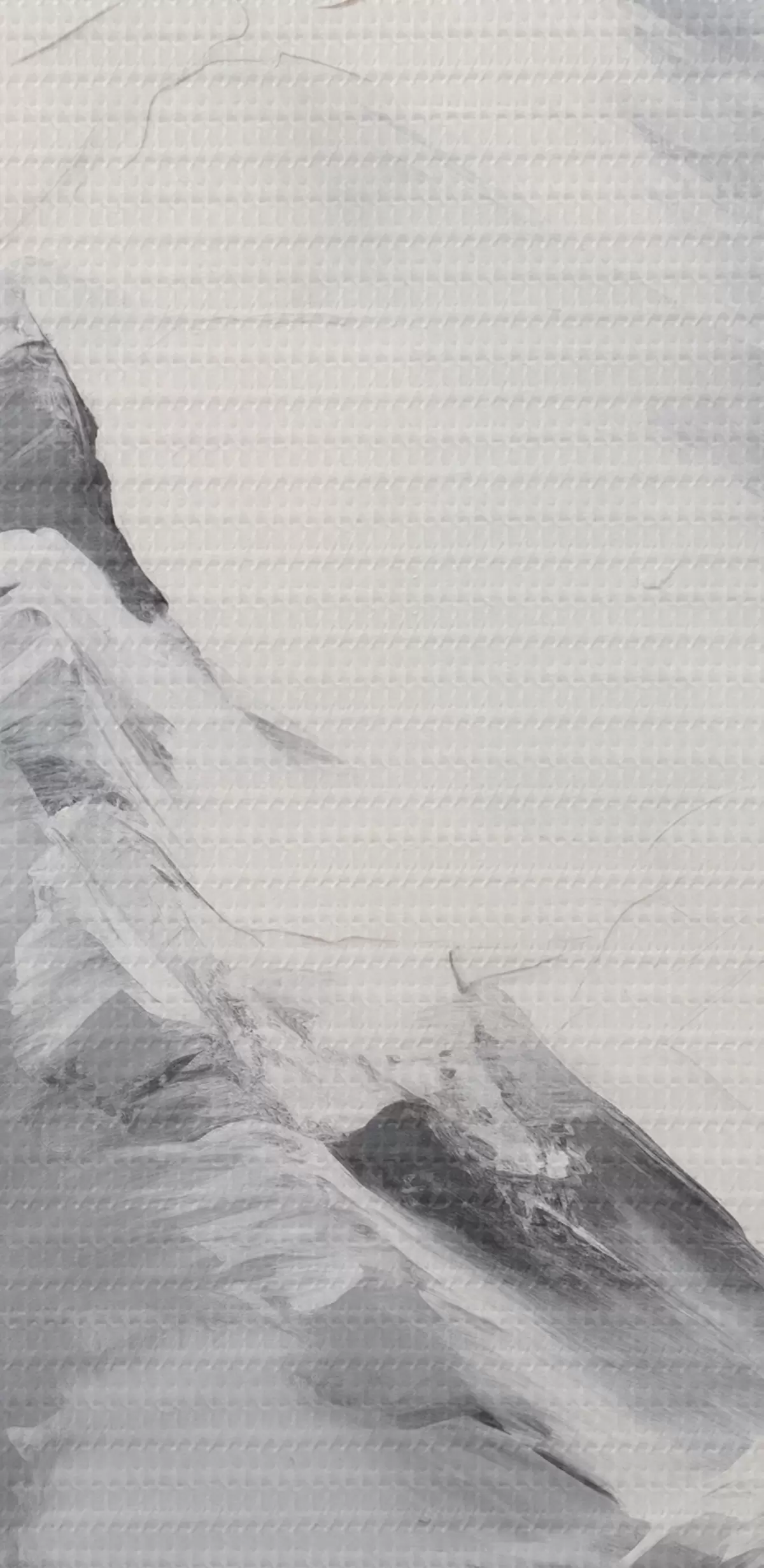 Obrázok Zasnežené horské vrcholy so sivými tieňmi, sivá obloha, ťahy štetcom, textúrované, minimalistické Nr r45933